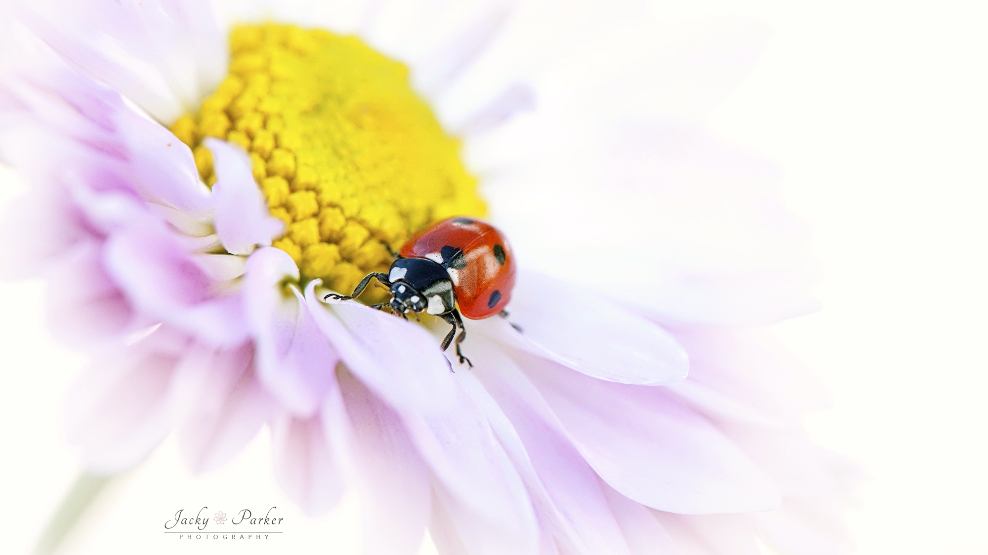 Edytor tapety: Biedronka obok żółtych pręcików kwiatka