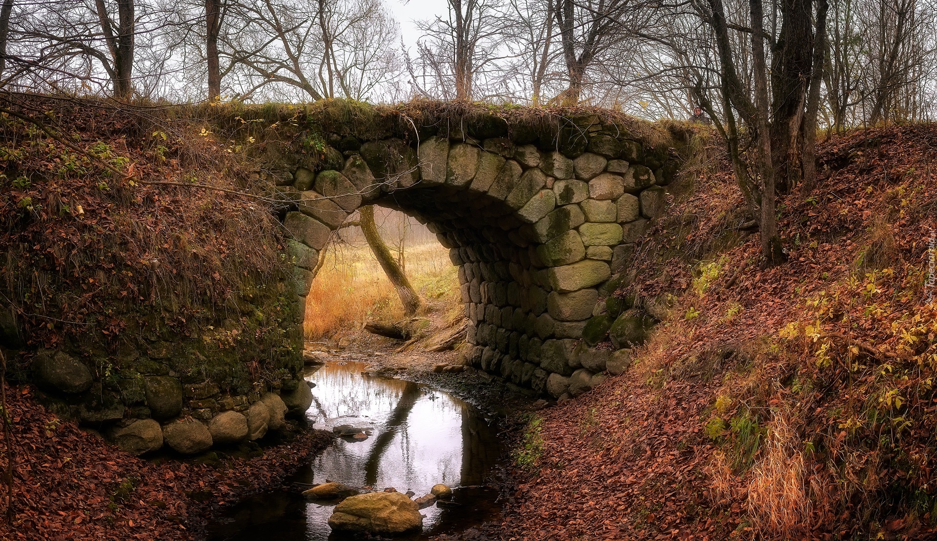 Edytor tapety: Opadłe liście obok kamiennego mostu na rzece