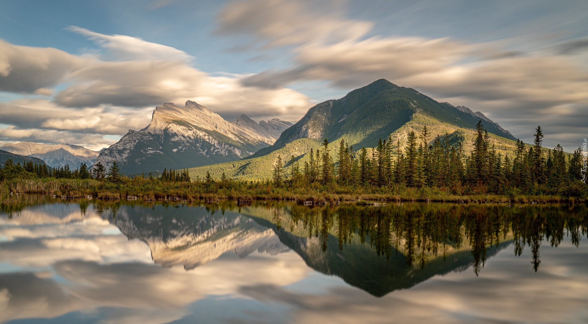 Edytor tapety: Jezioro na tle górskich szczytów i drzew