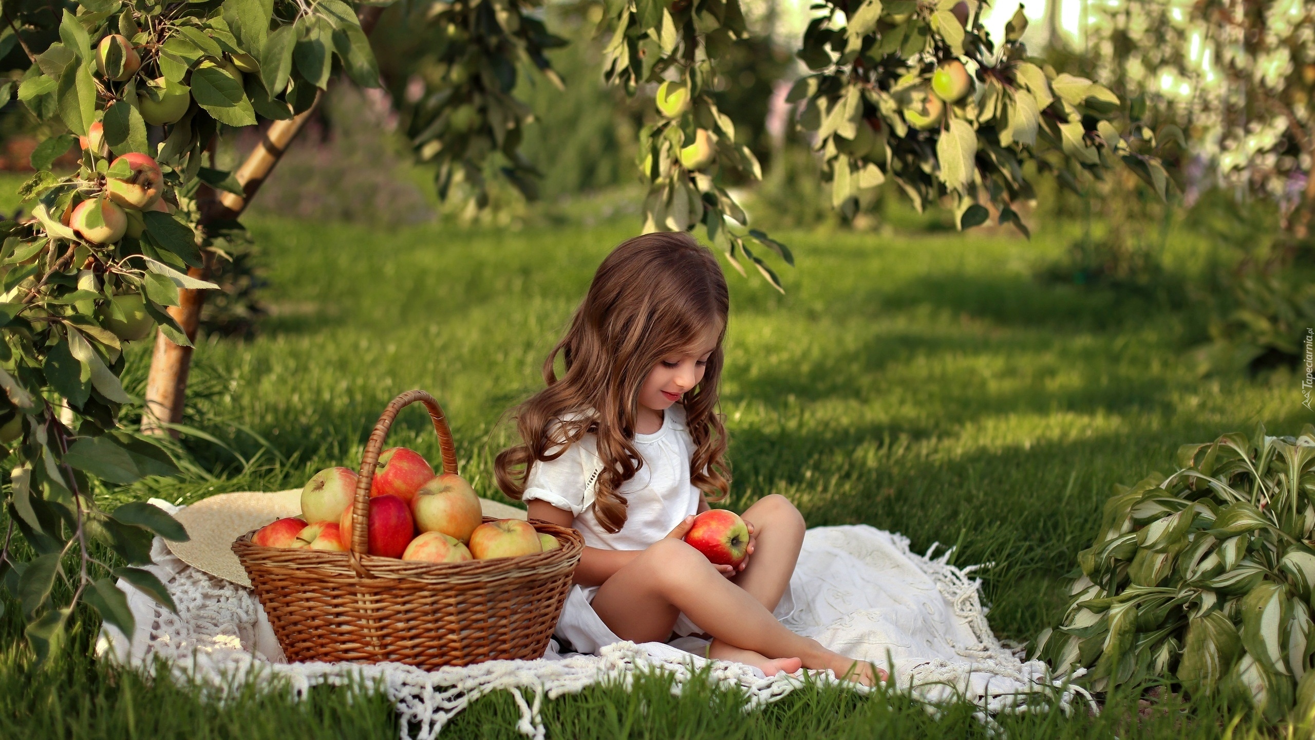 Edytor tapety: Kosz jabłek i dziewczynka na kocu
