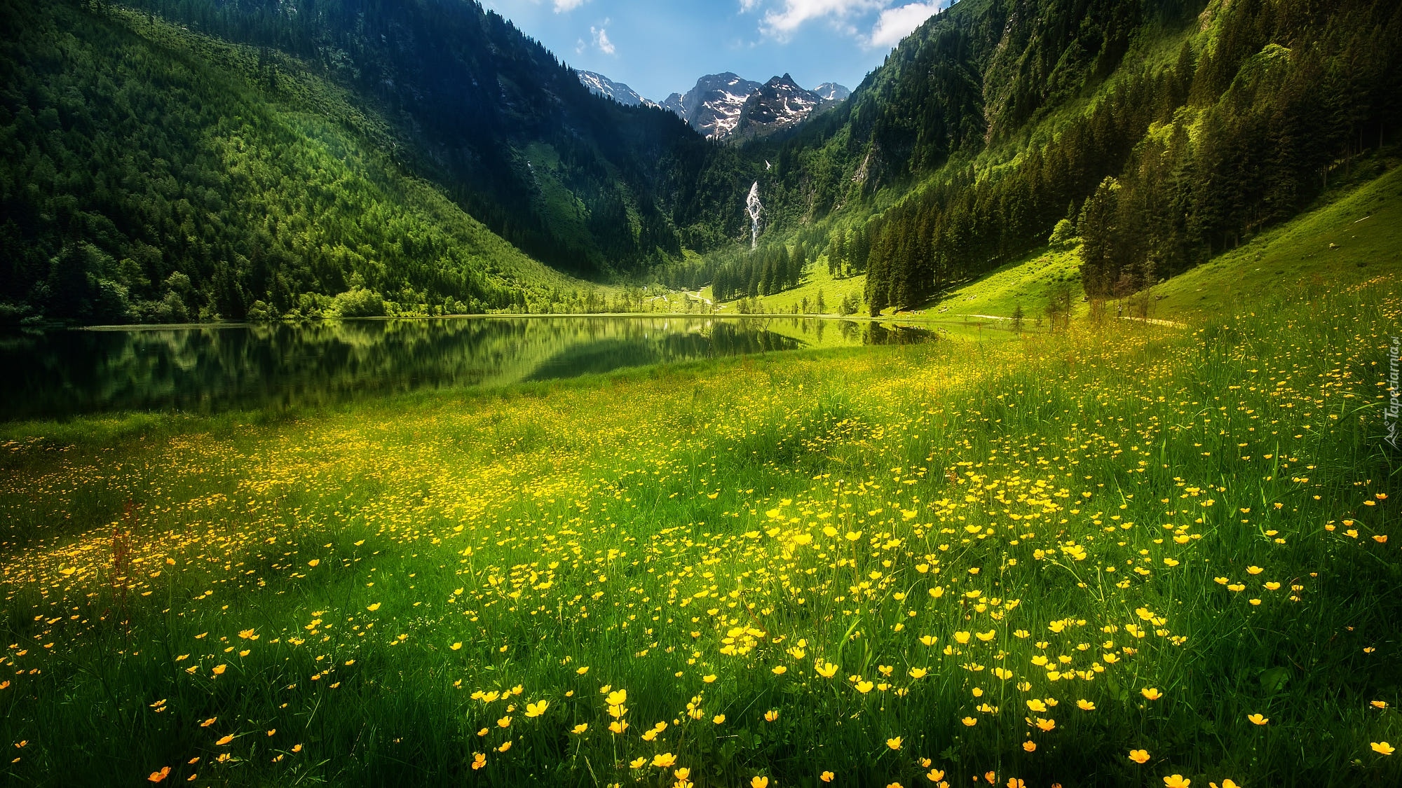 Edytor tapety: Żółte kwiaty na łące obok górskiego jeziora