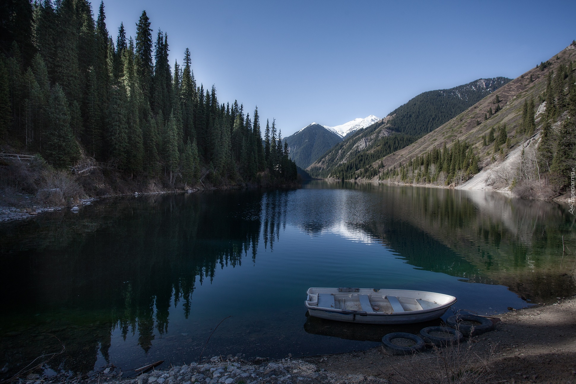 Edytor tapety: Łódka na jeziorze Kolsay w Kazachstanie