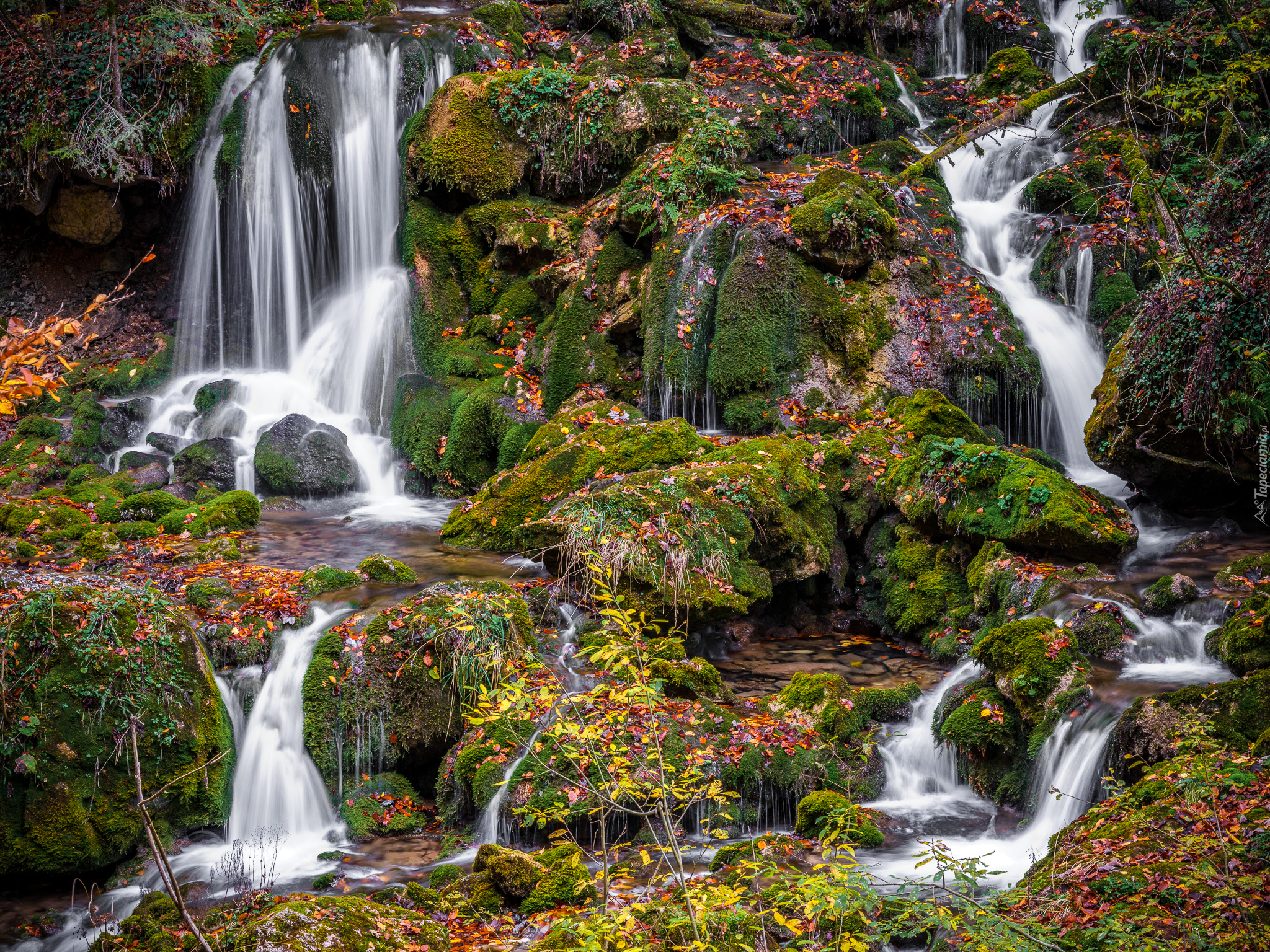 Edytor tapety: Małe wodospady na omszałych skałach