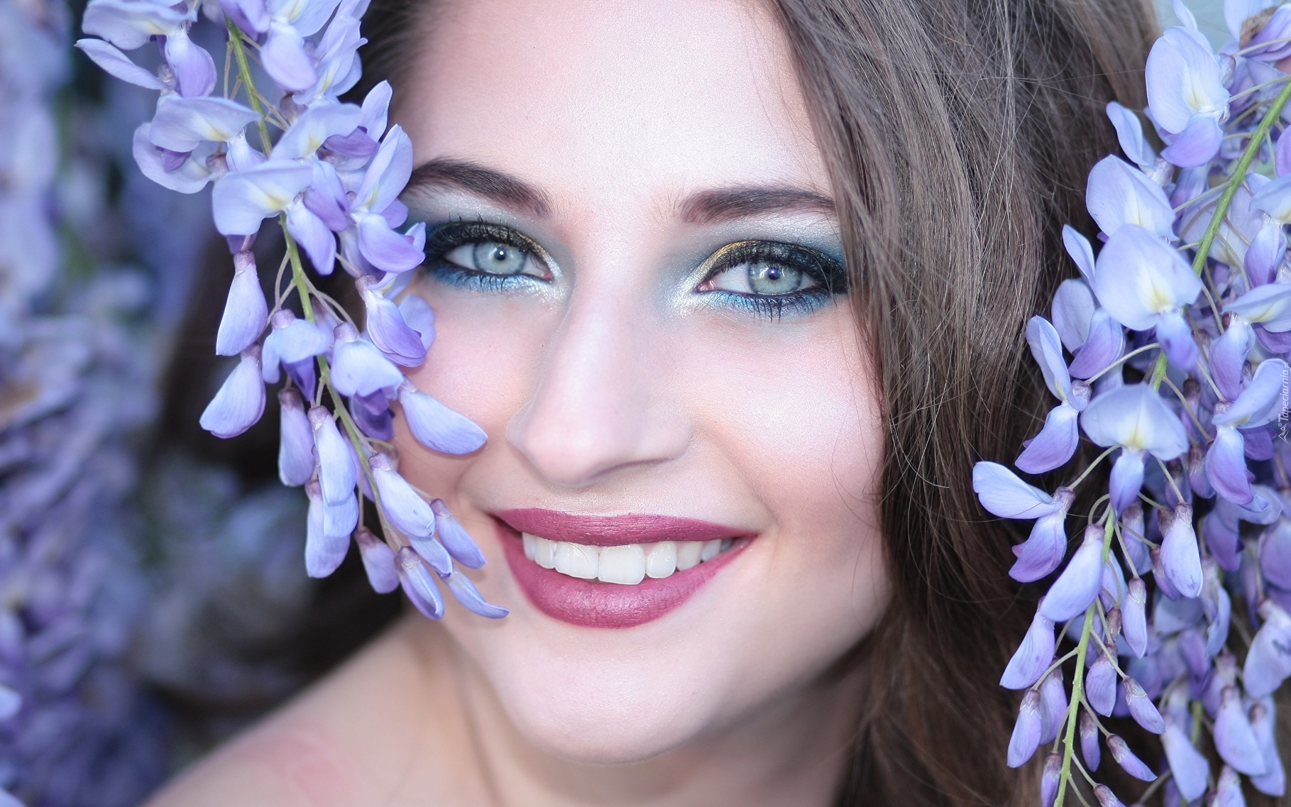 Edytor tapety: Uśmiechnięta szatynka pośród kwiatów glicynii