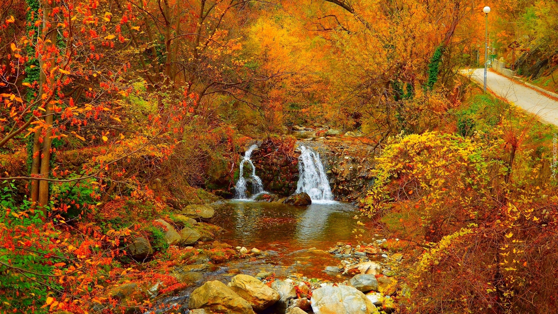 Edytor tapety: Rzeczka wśród jesiennych drzew