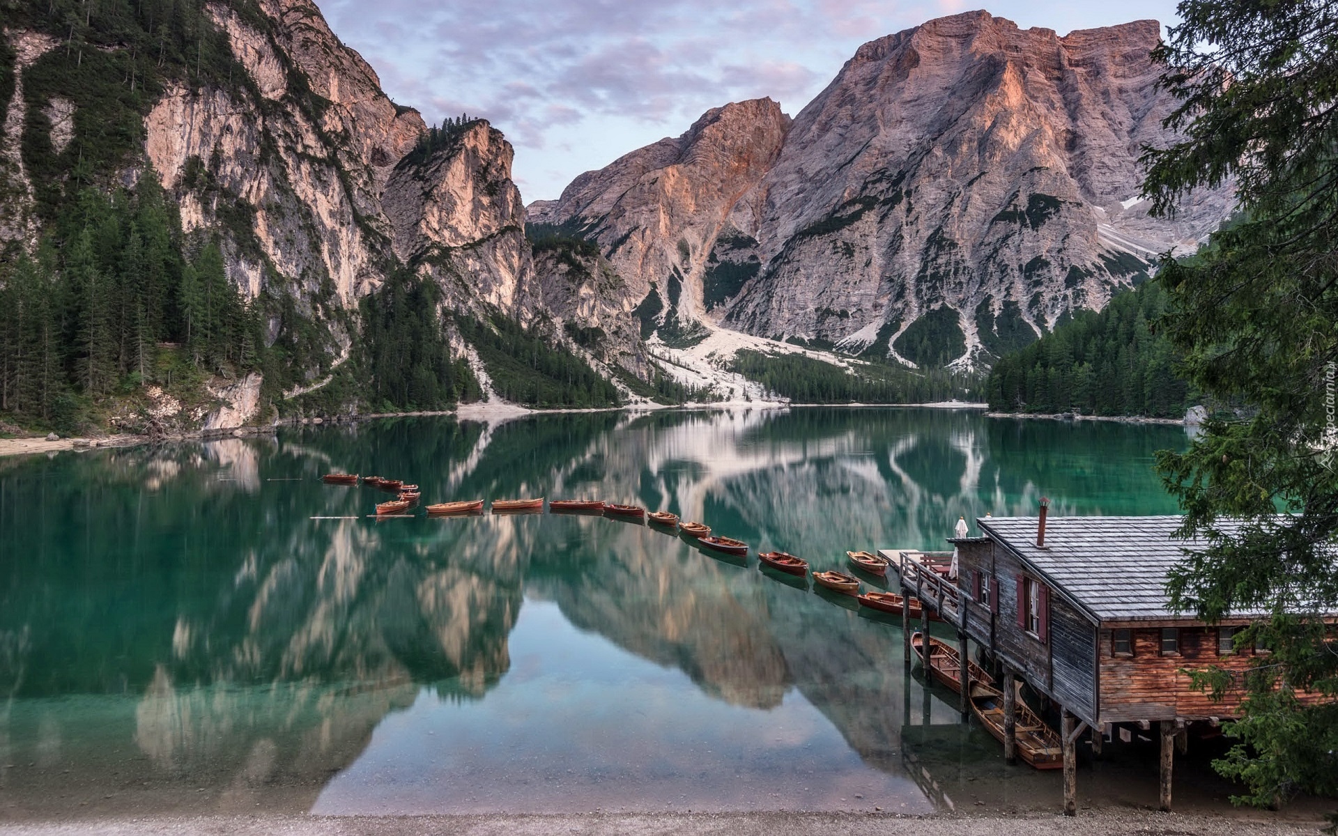 Edytor tapety: Domek i łódki nad jeziorem Pragser Wildsee