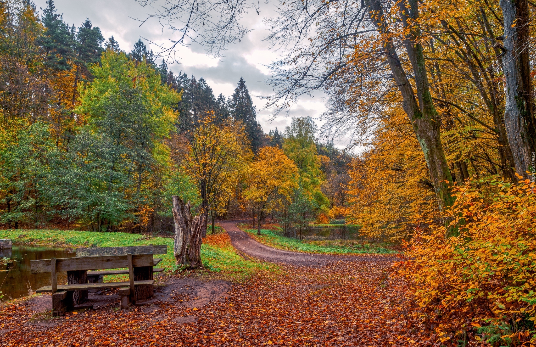 Edytor tapety: Ławki obok stawu pośród jesiennych drzew