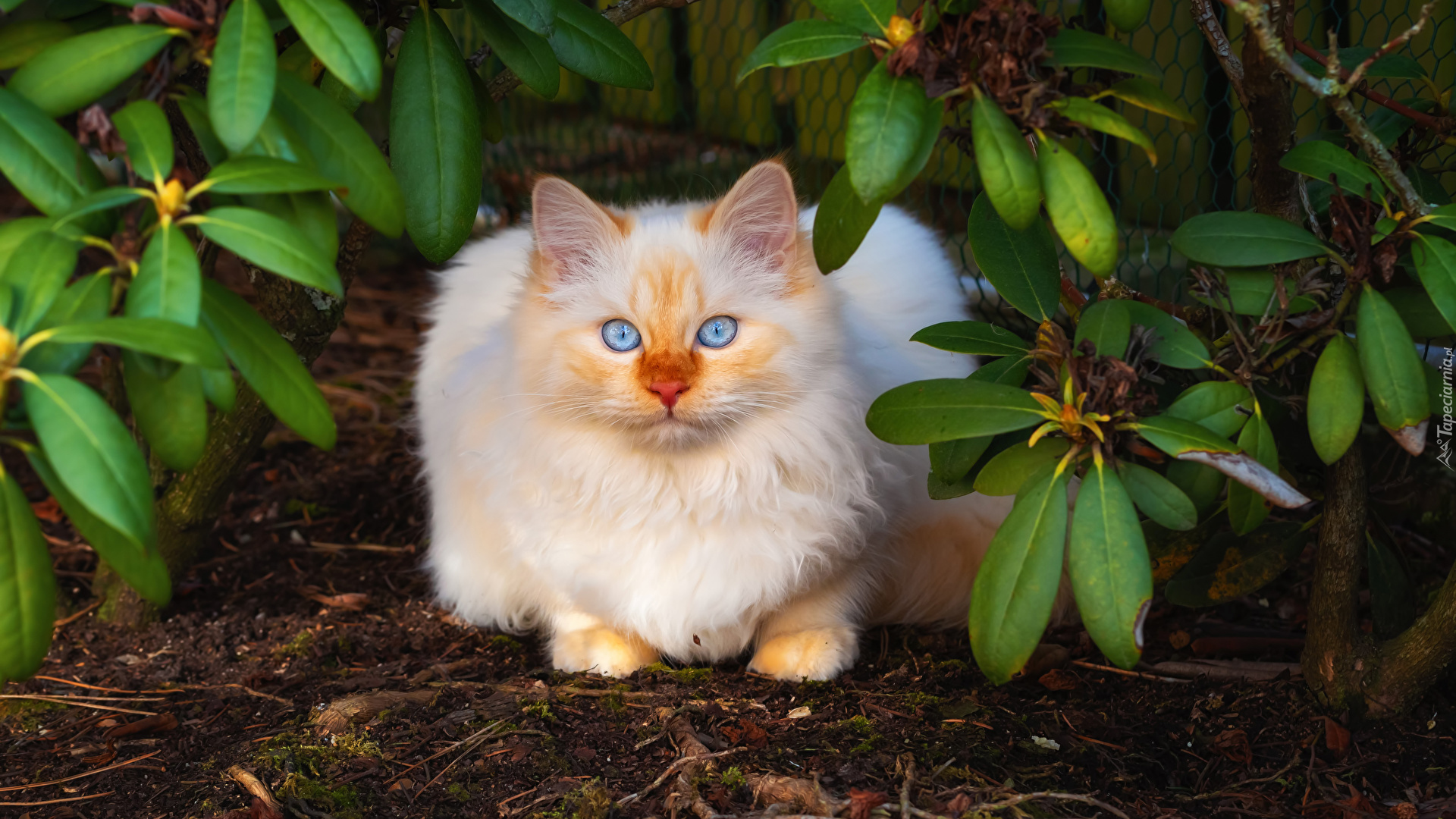 Edytor tapety: Niebieskooki kot pod różanecznikiem
