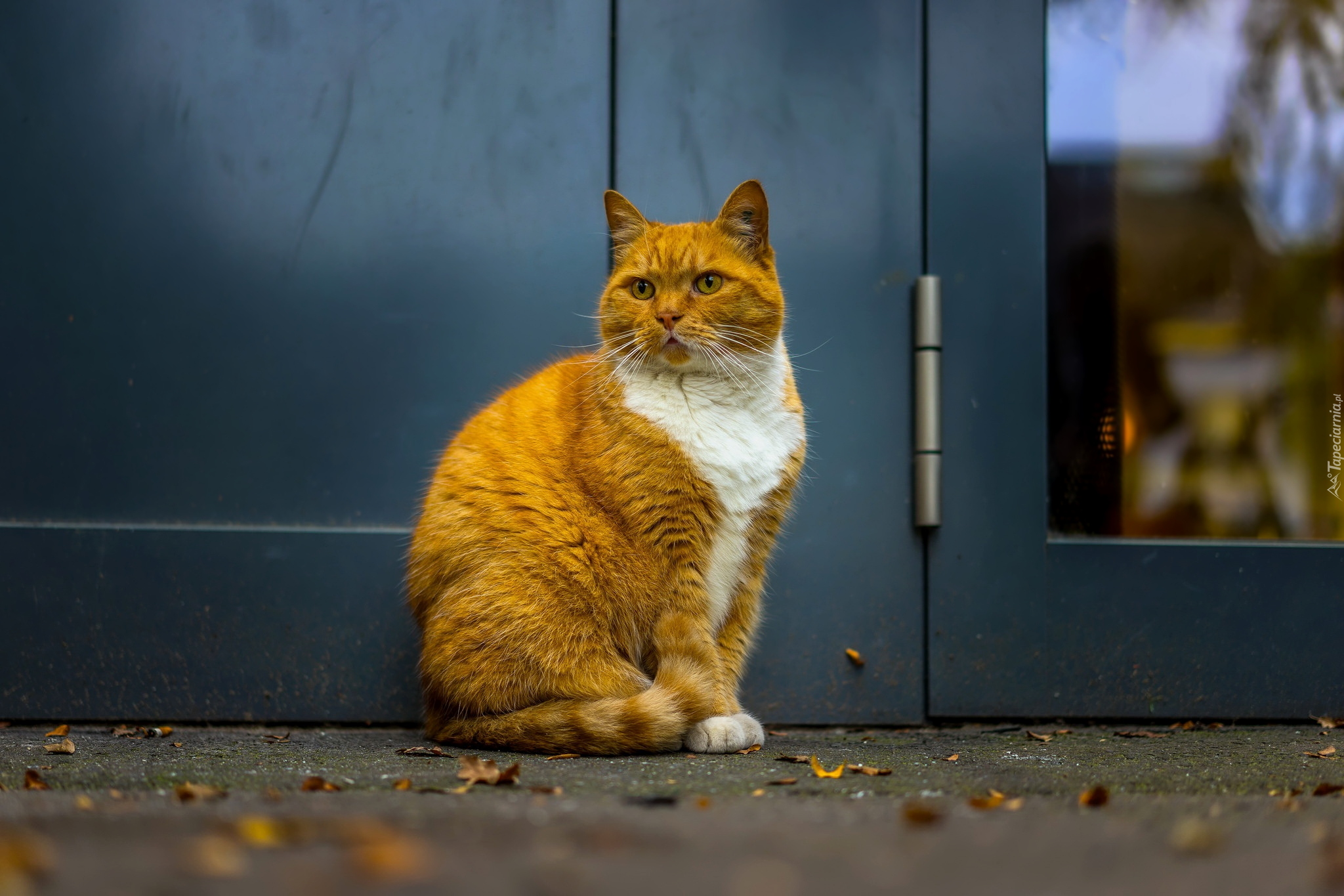 Edytor tapety: Rudo-biały kot siedzący przed drzwiami