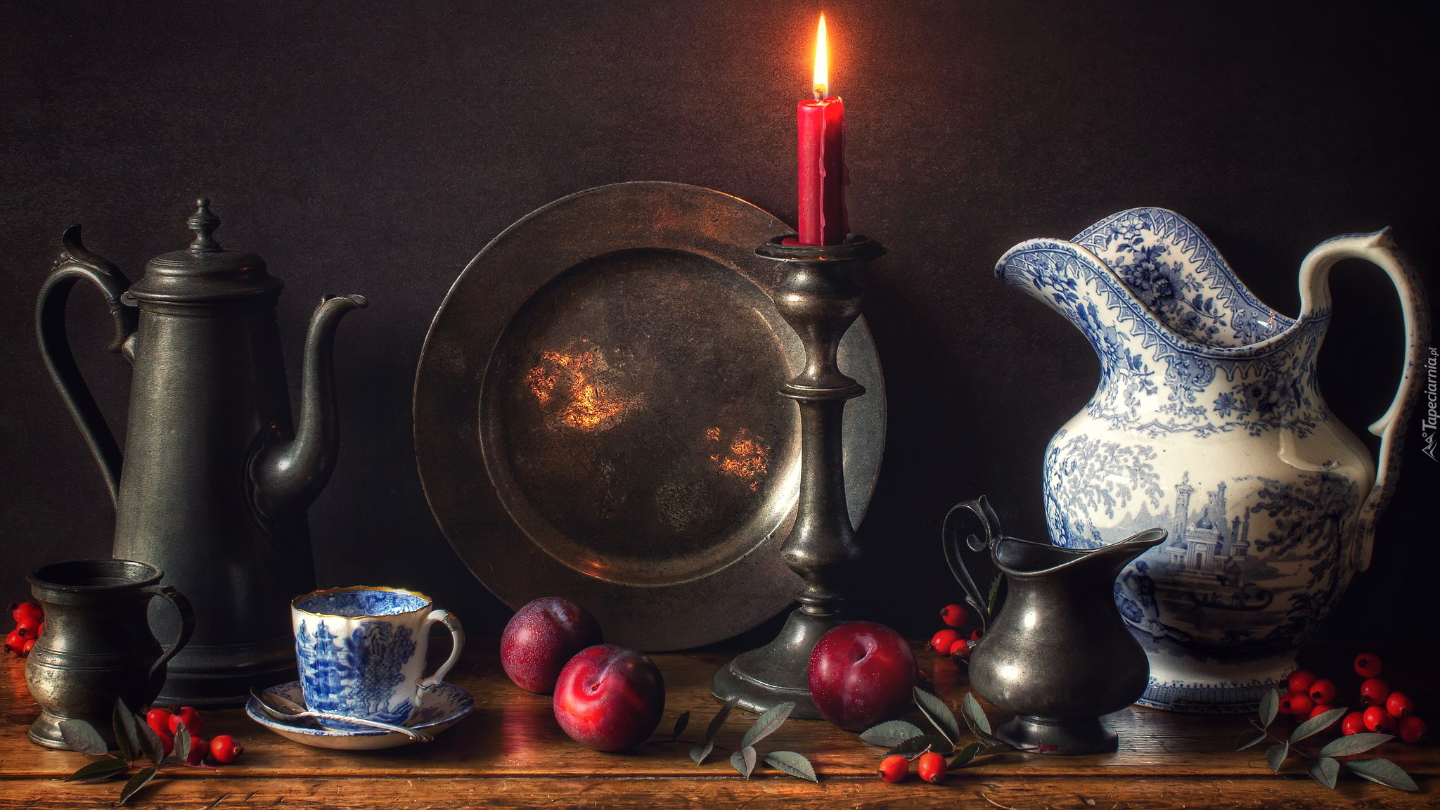 Edytor tapety: Nektaryny obok dzbanków i świecznika