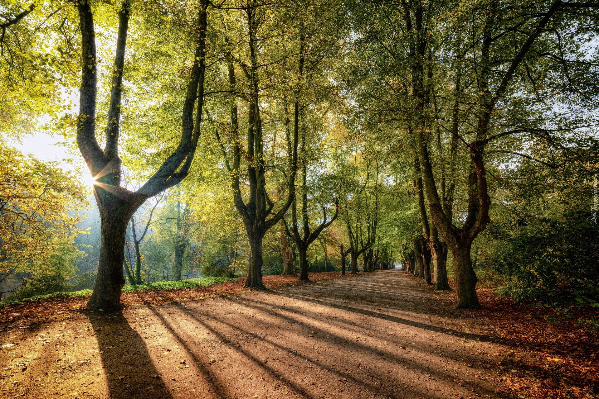 Edytor tapety: Rozświetlone słońcem drzewa wzdłuż drogi