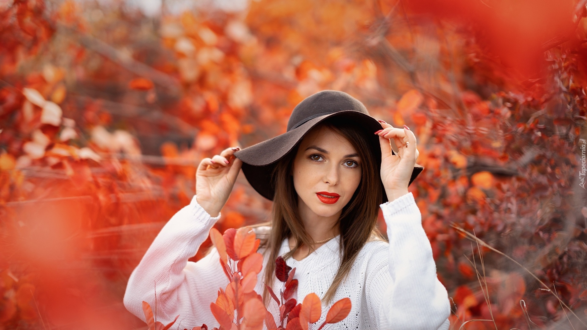 Edytor tapety: Kobieta w kapeluszu pośród czerwonych liści