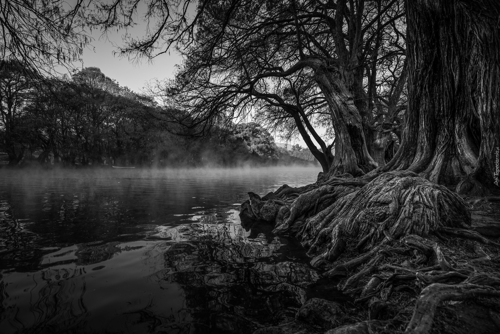 Edytor tapety: Drzewa nad rzeką na czarno-białej fotografii
