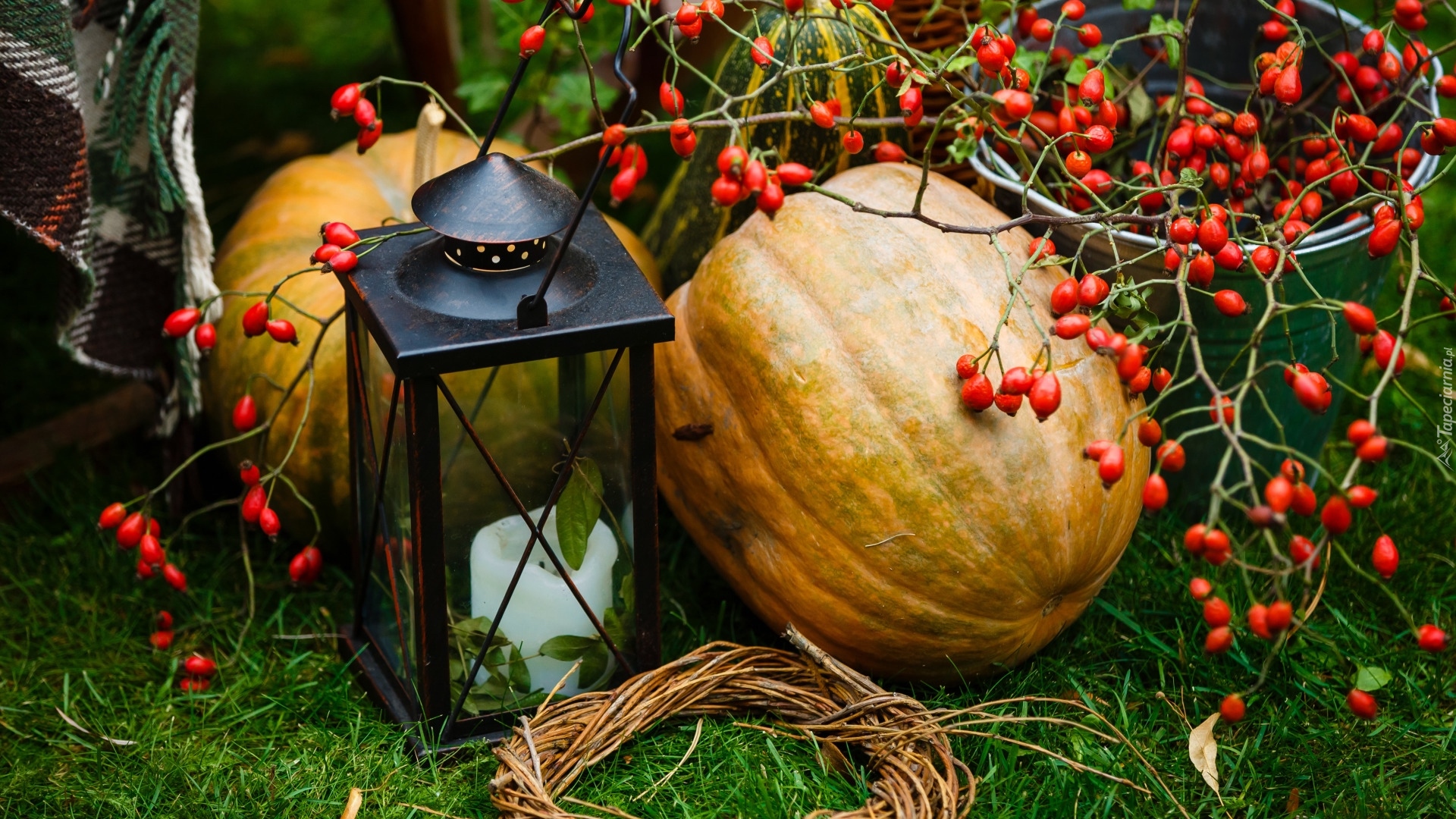 Edytor tapety: Lampion obok dyni wśród gałązek głogu