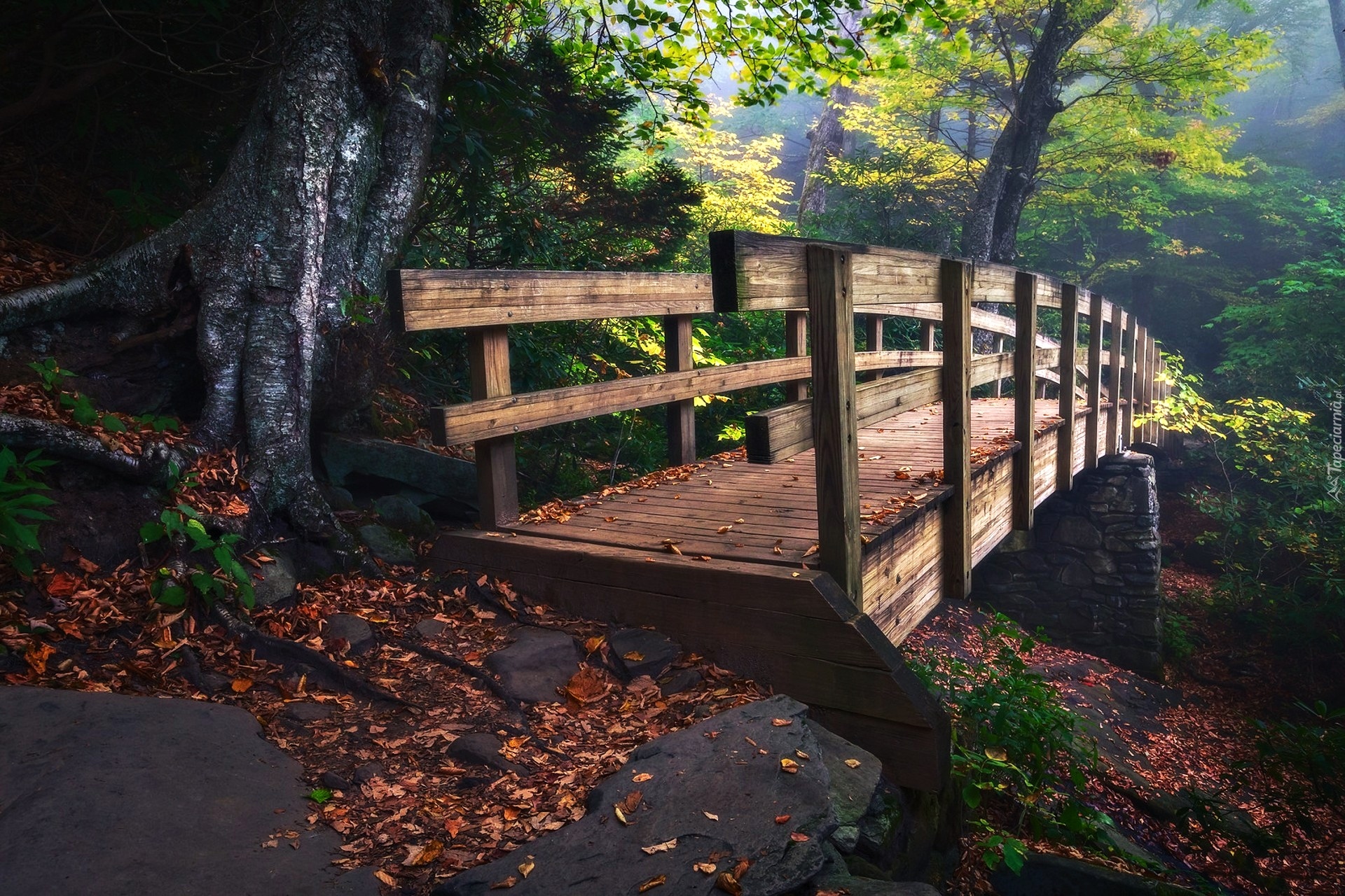 Edytor tapety: Most na kamiennych filarach pod drzewem w lesie