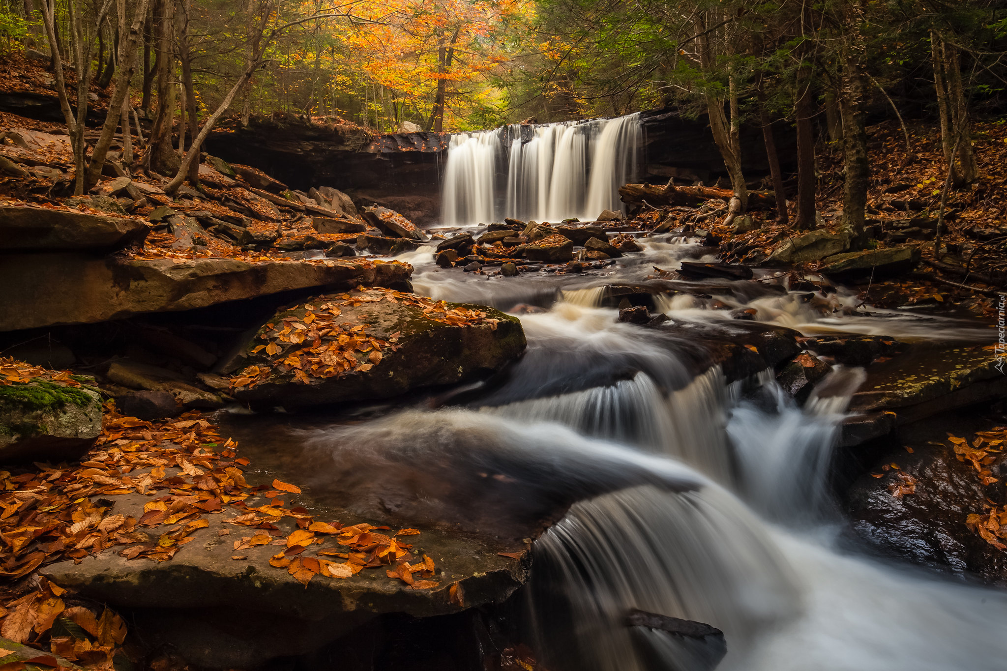 Edytor tapety: Rzeka płynąca po kamieniach od wodospadu