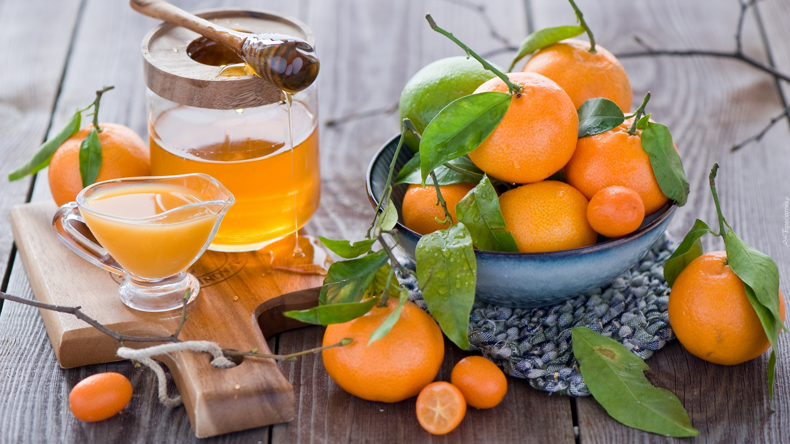 Edytor tapety: Mandarynki obok soku i miodu