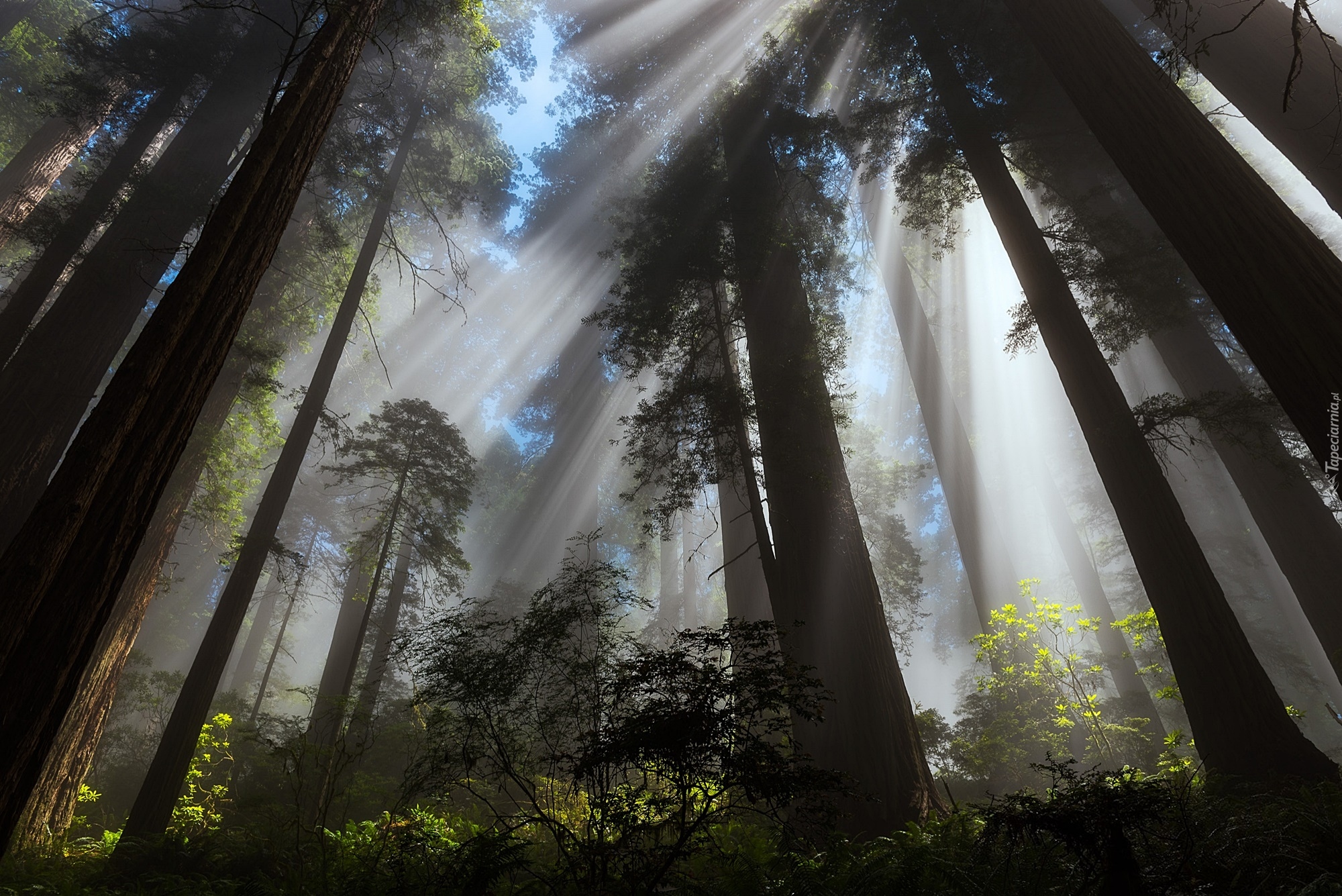Edytor tapety: Światło padające na sekwoje w lesie