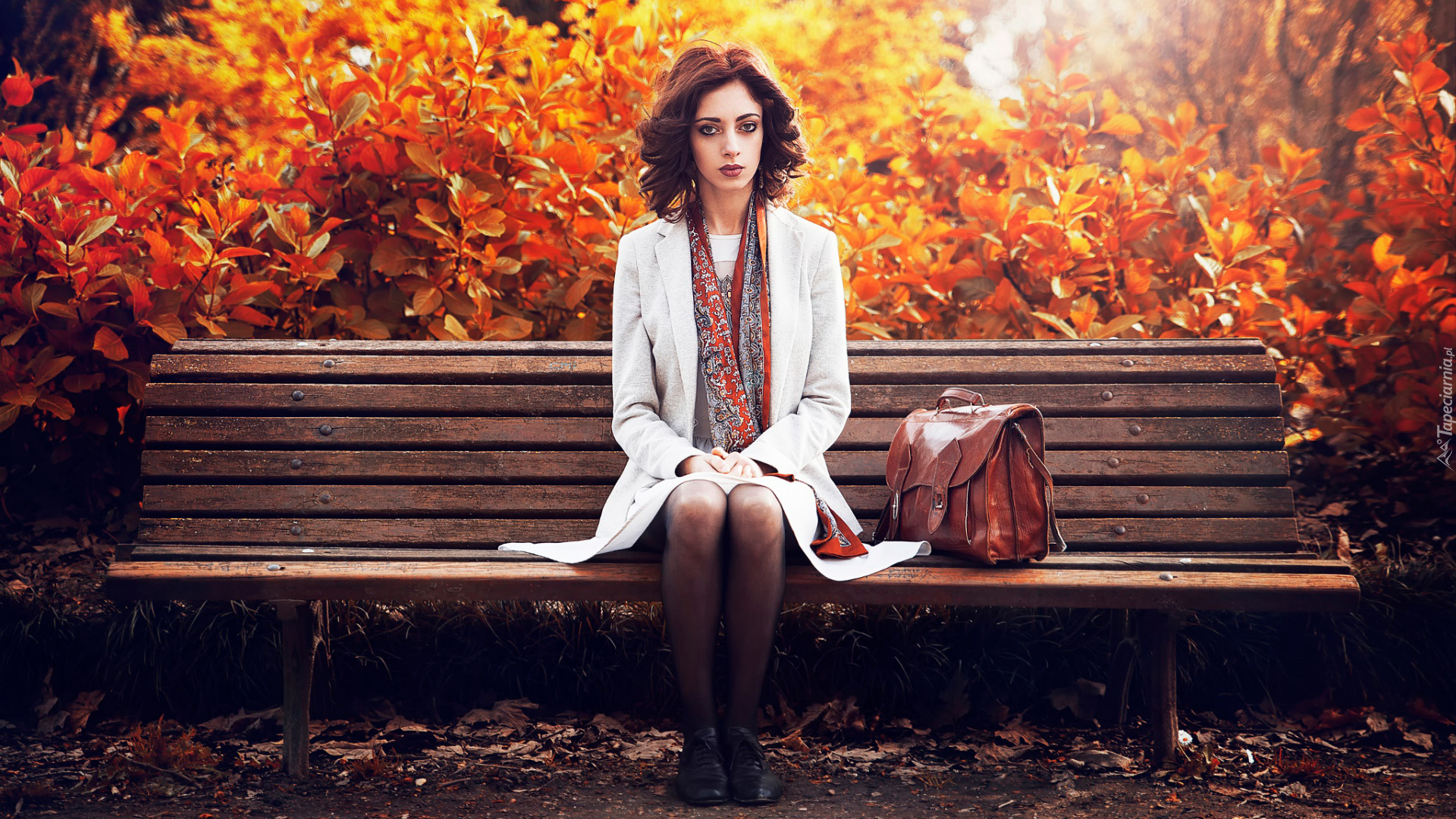 Edytor tapety: Kobieta z torebką na ławce