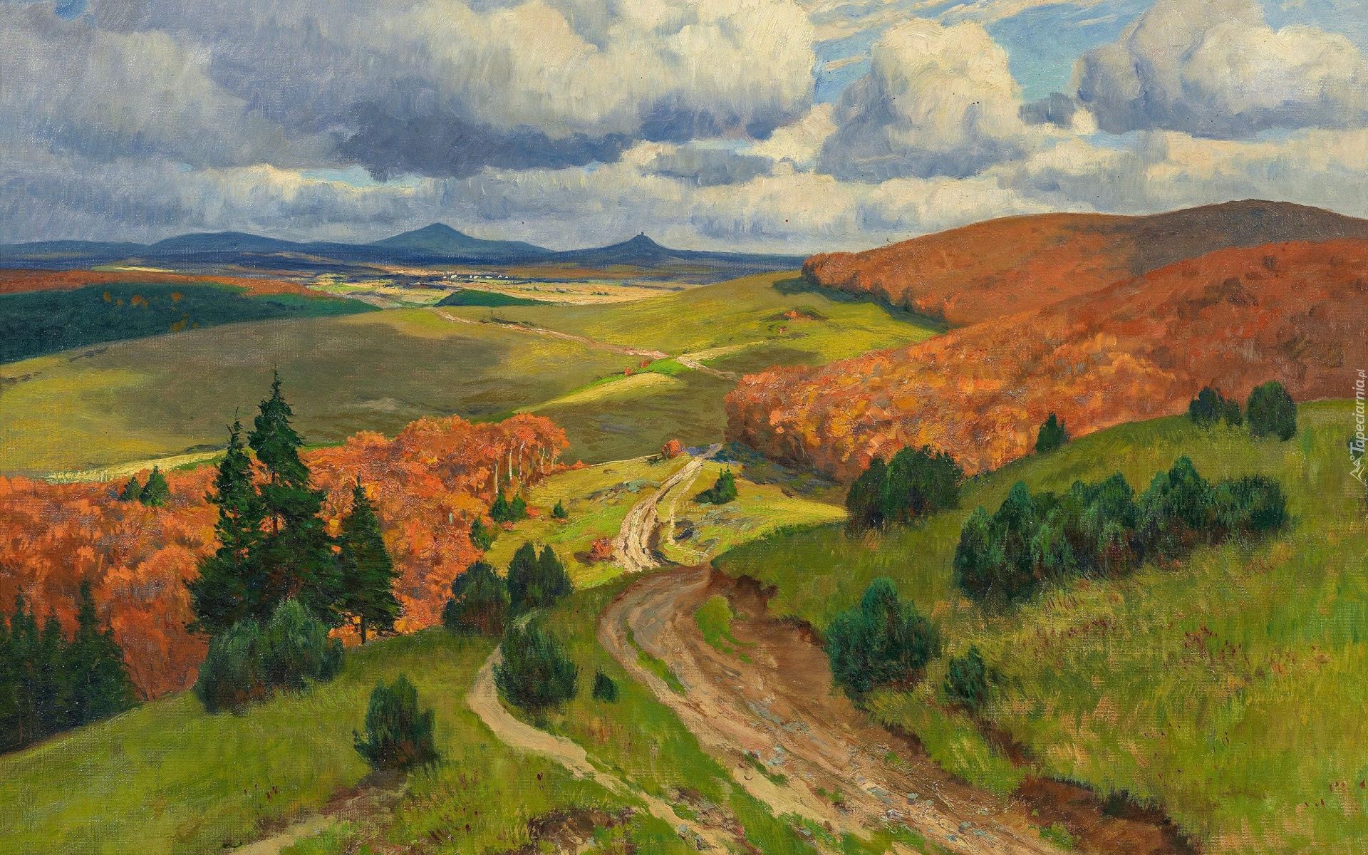 Edytor tapety: Jesienny krajobraz wzgórz na obrazie Fritza von Wille