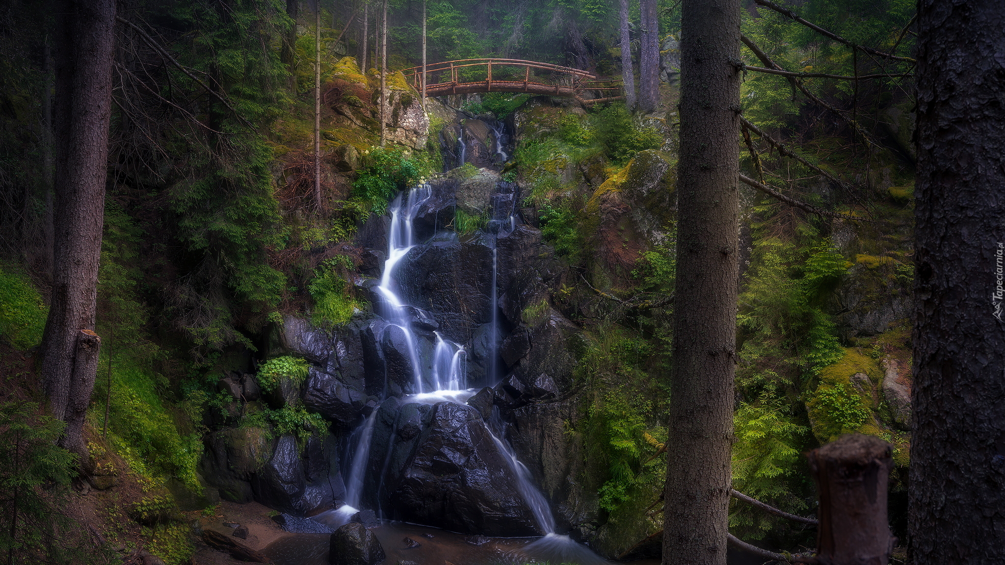 Edytor tapety: Drewniany mostek nad skalnym wodospadem w lesie