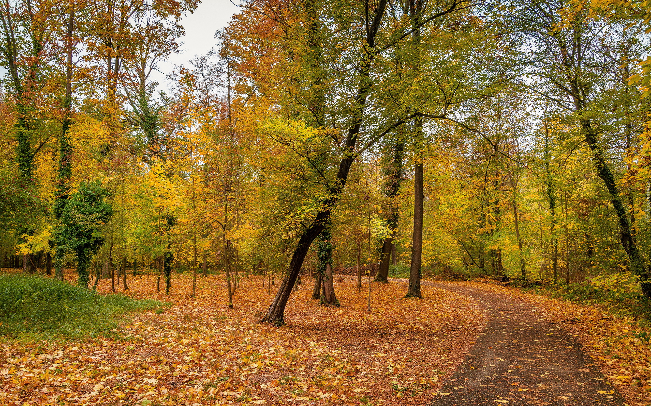 Edytor tapety: Pochyłe drzewa nad drogą w parku