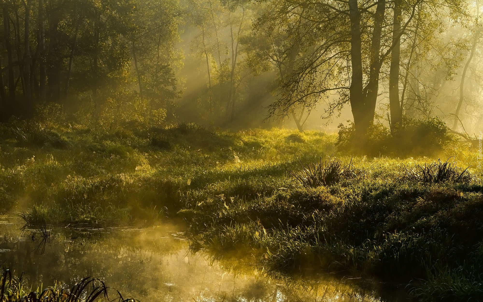 Edytor tapety: Przebijające promienie słońca w lesie na moczarach