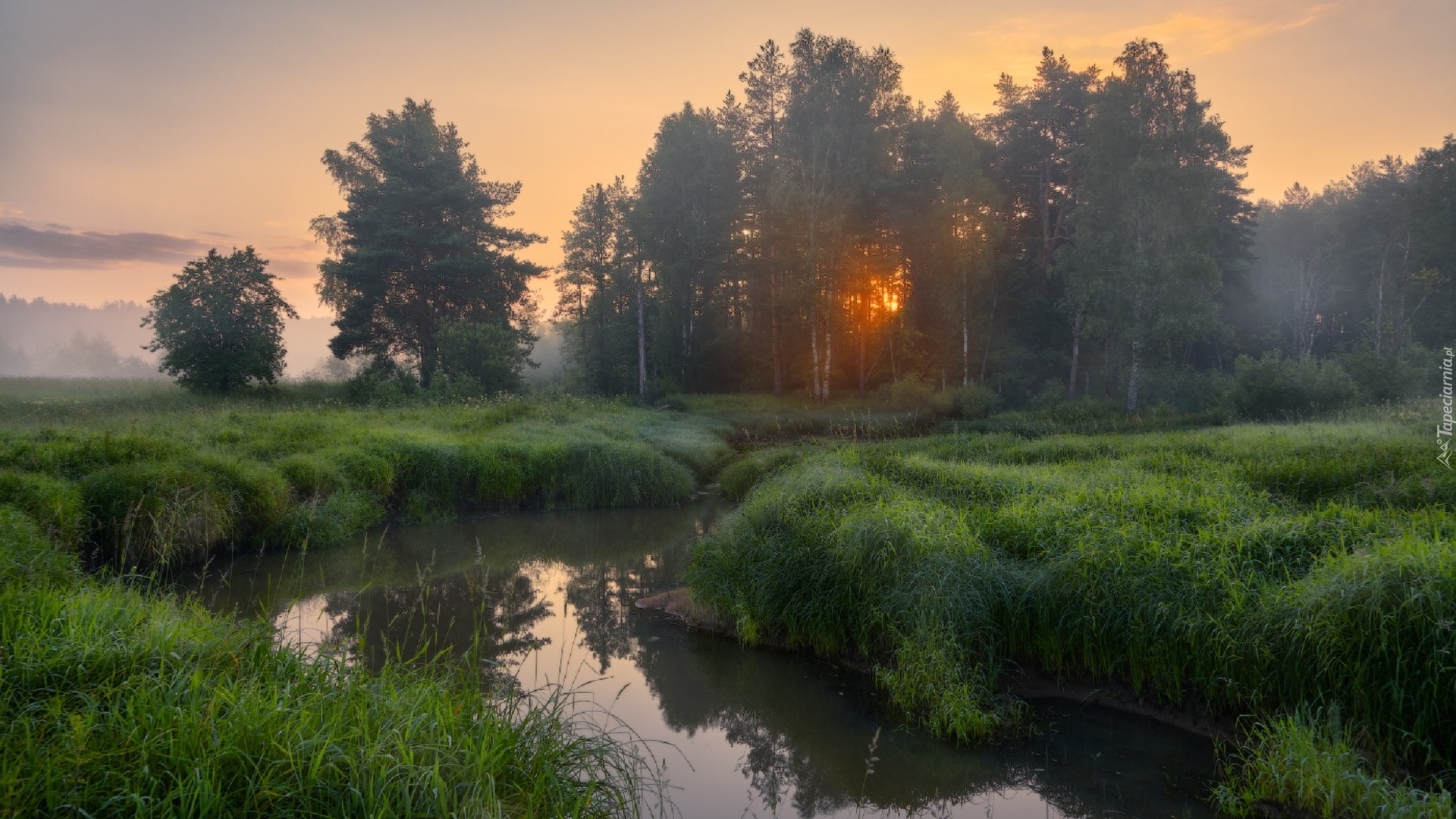 Edytor tapety: Gęsta trawa nad rzeką na tle drzew