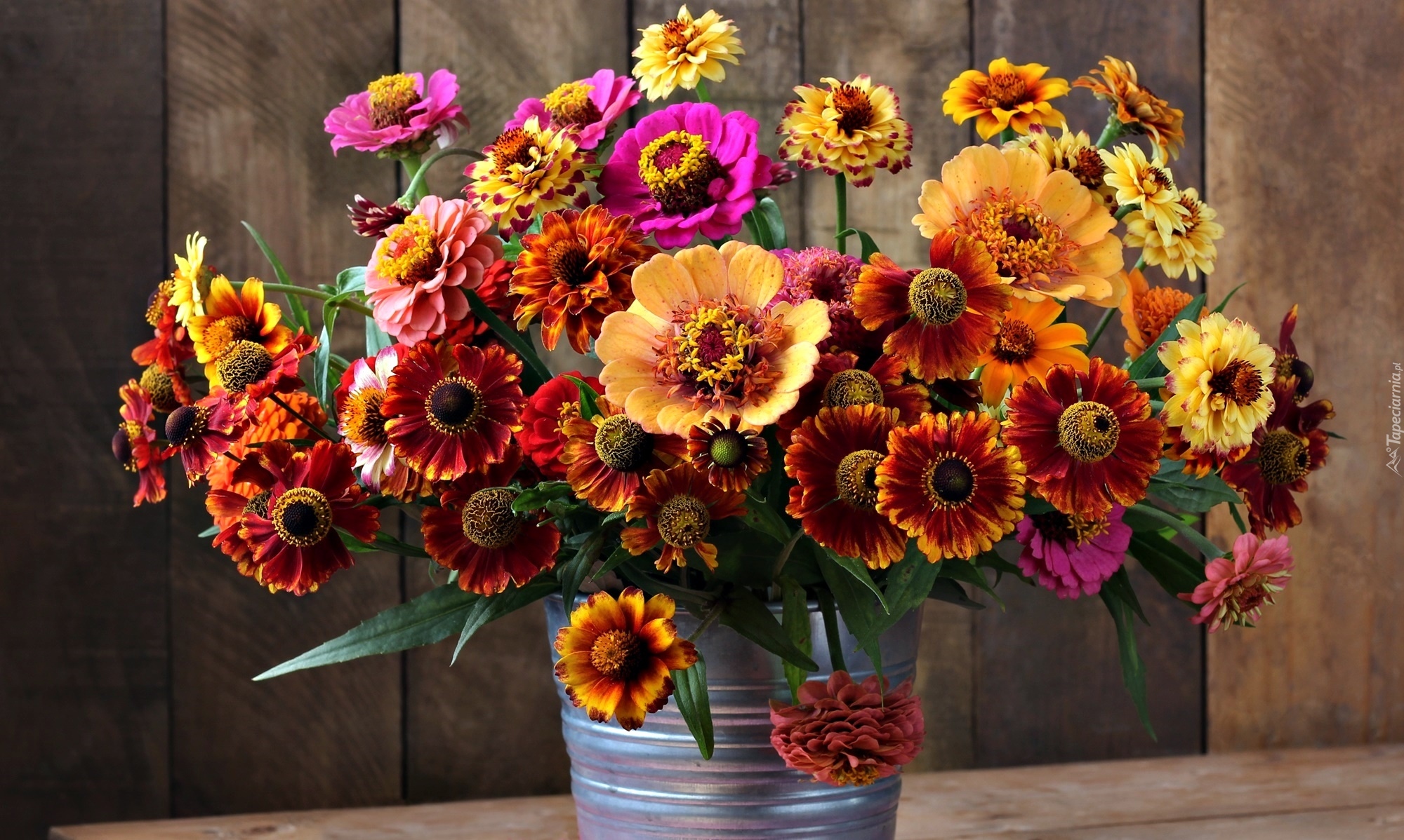 Edytor tapety: Bukiet dzielżanów i cynii w wiaderku