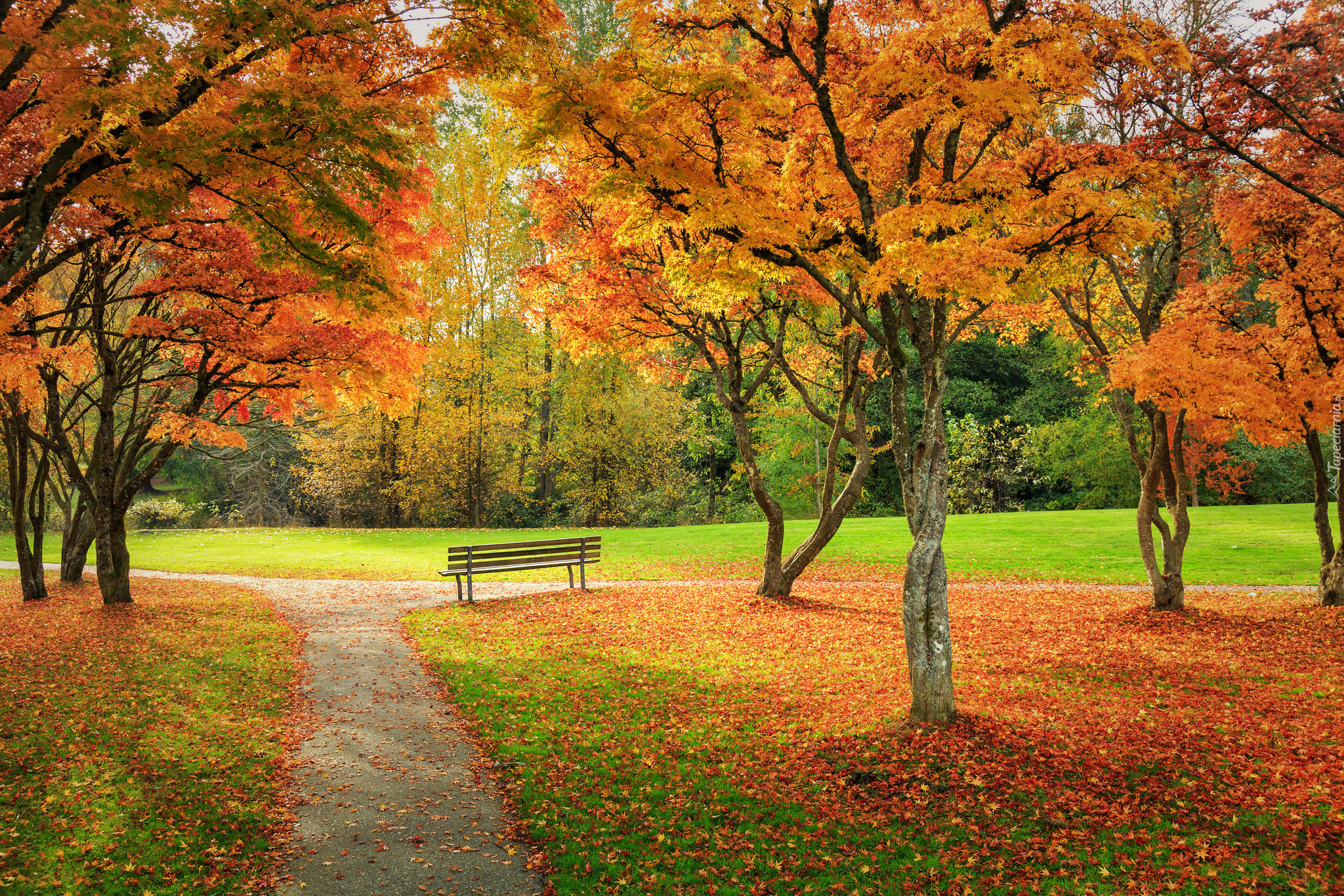 Edytor tapety: Ławka przy ścieżce w jesiennym parku