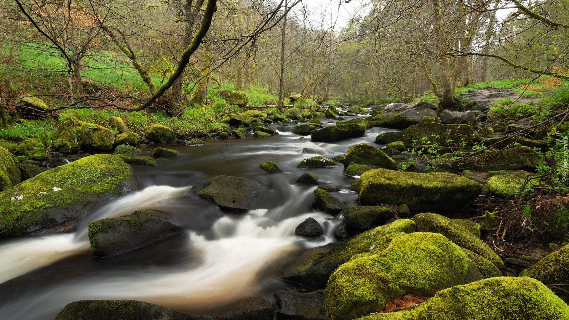 Edytor tapety: Drzewa nad rzeczką i omszałymi kamieniami