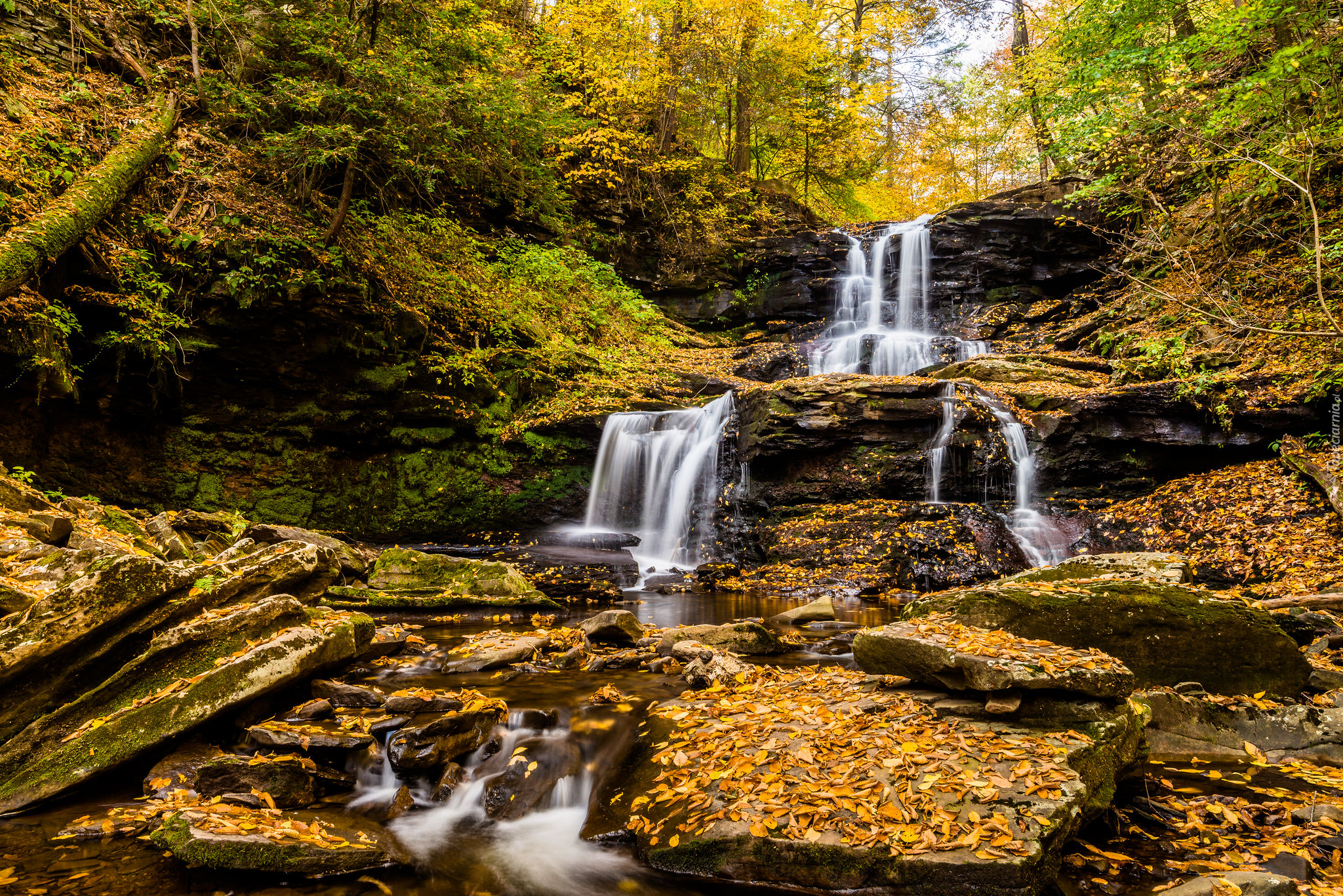 Edytor tapety: Wodospad na skałach pośród opadłych liści