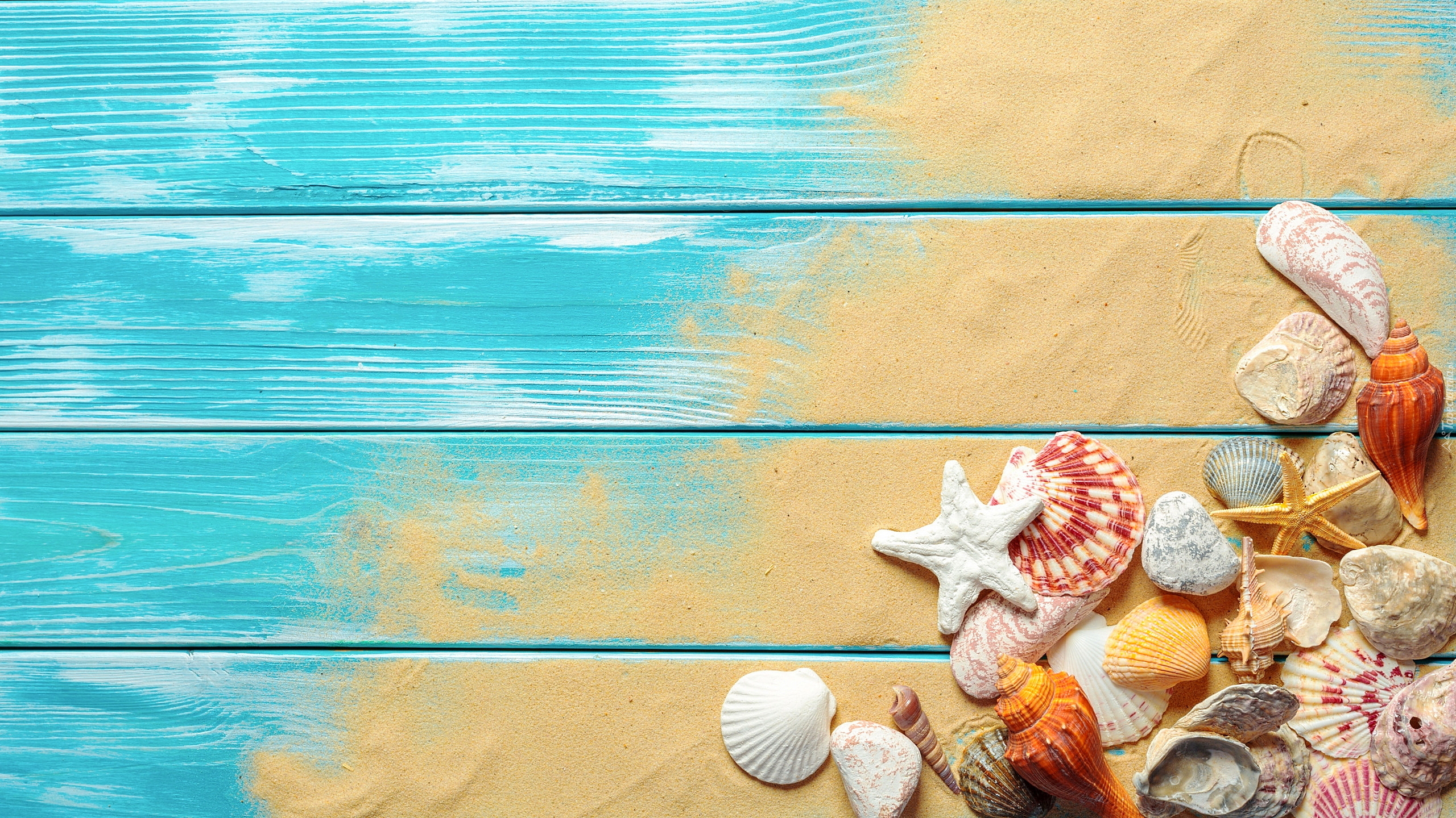 Edytor tapety: Muszelki i rozgwiazdy z piaskiem na niebieskich deskach