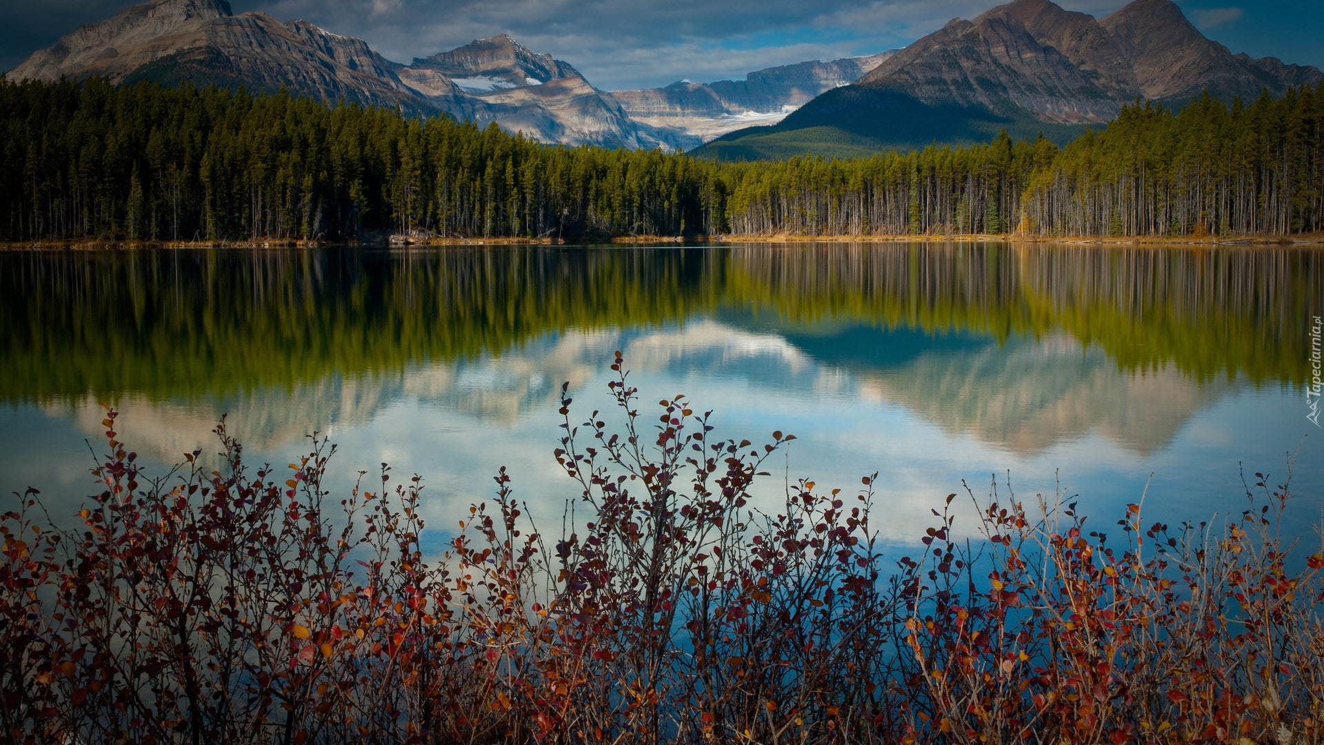 Edytor tapety: Krzewy i drzewa wokół jeziora w górach