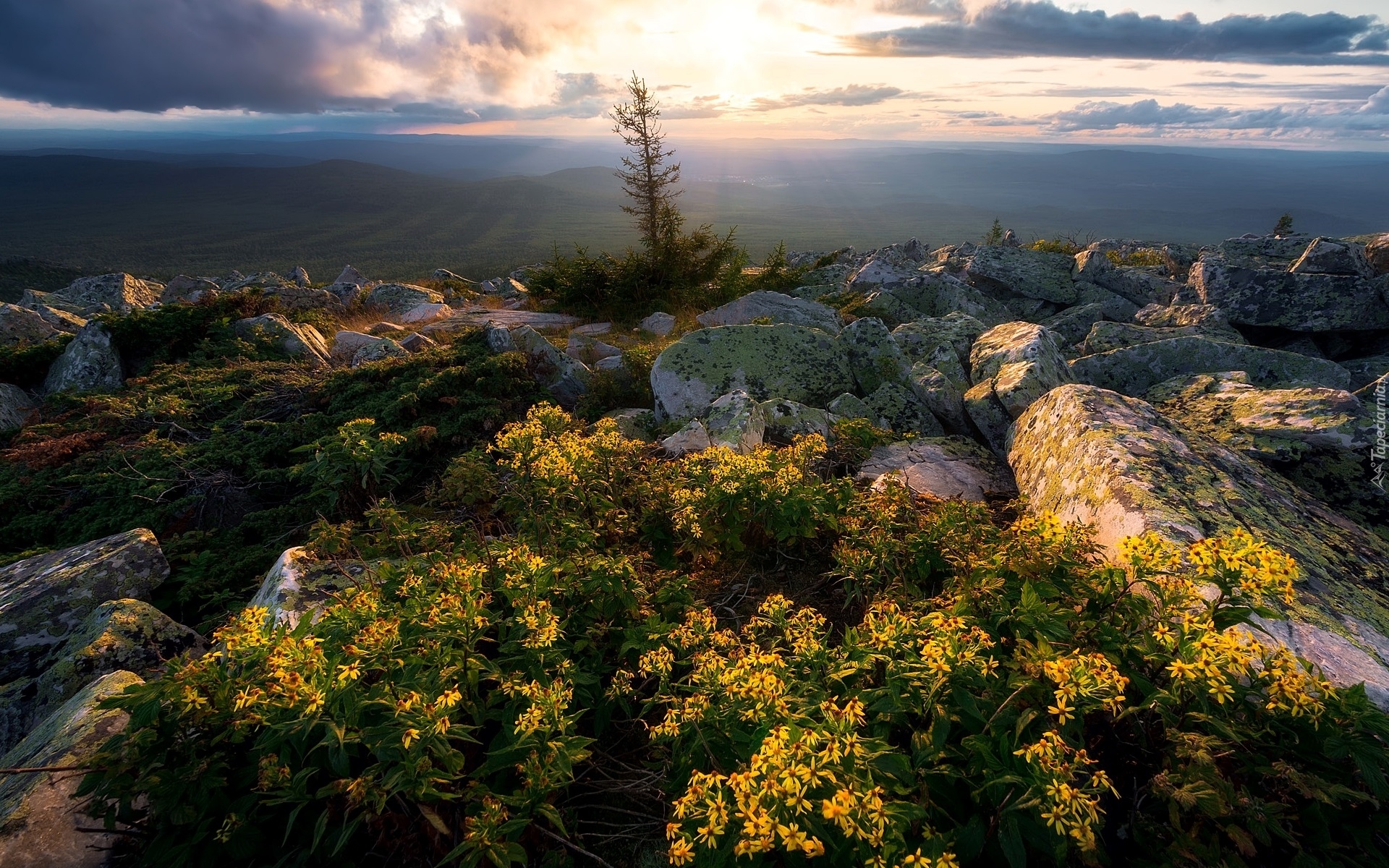 Edytor tapety: Żółte kwiaty pomiędzy skałami na wzgórzu