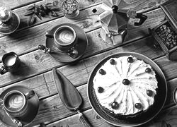 Edytor tapety: Tort i kawa w filiżankach na deskach