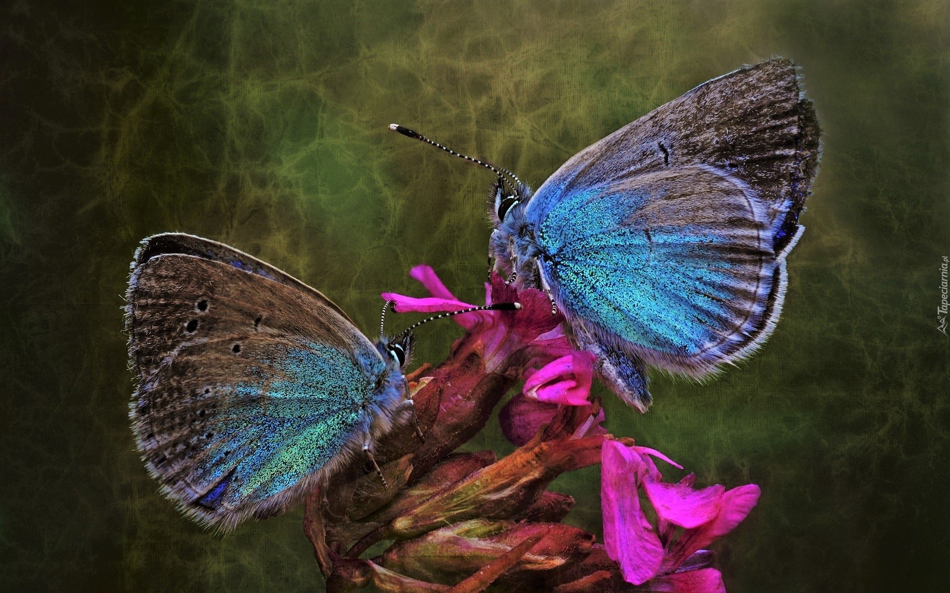 Edytor tapety: Dwa niebieskie motyle na kwiatku