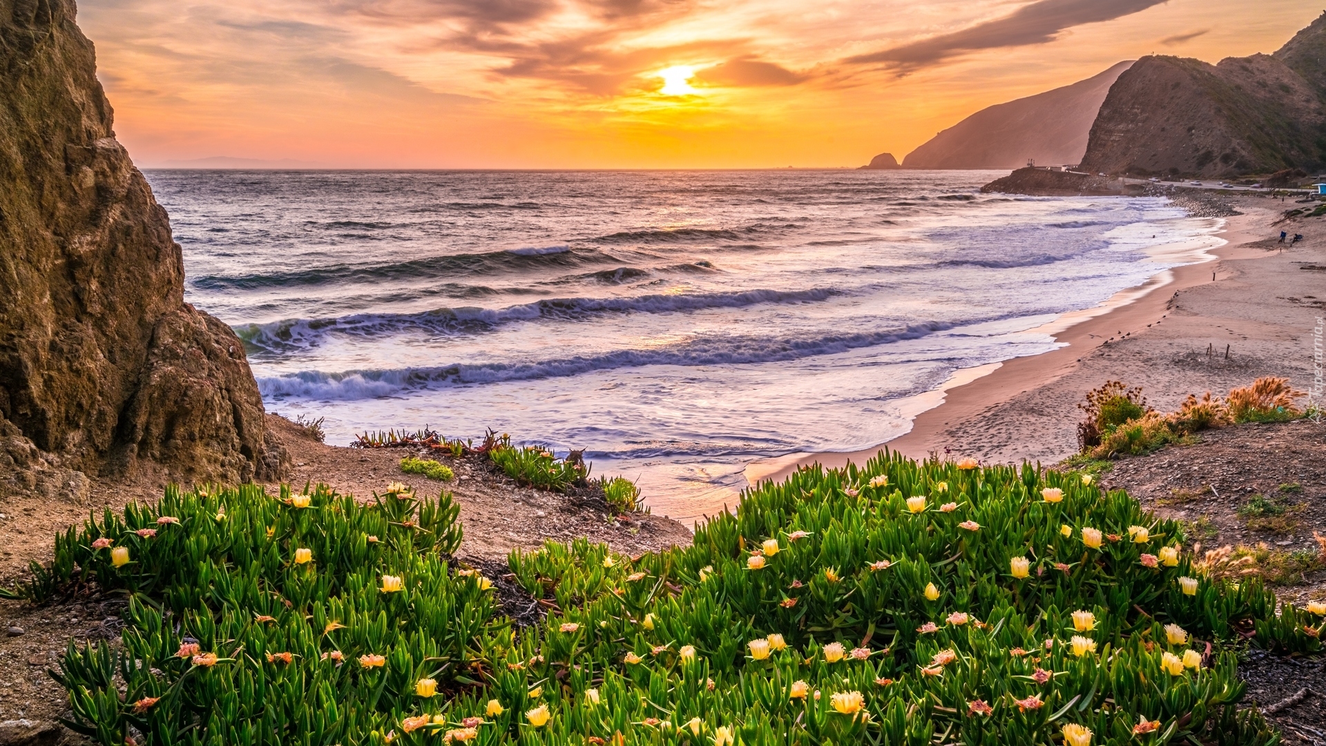 Edytor tapety: Kępy trawy i kwiatów nad brzegiem morza