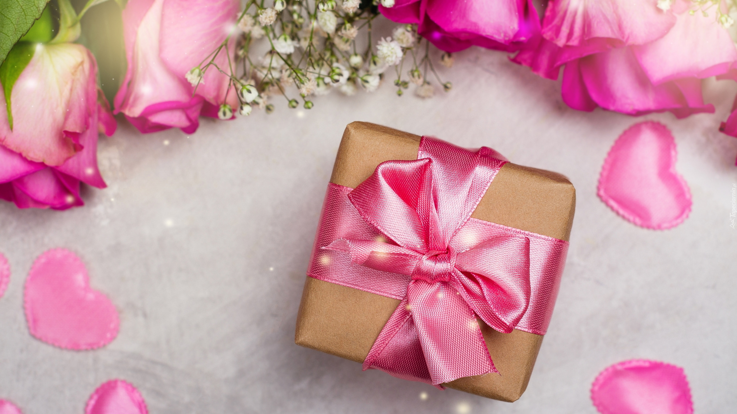 Edytor tapety: Róże i serduszka położone obok prezentu