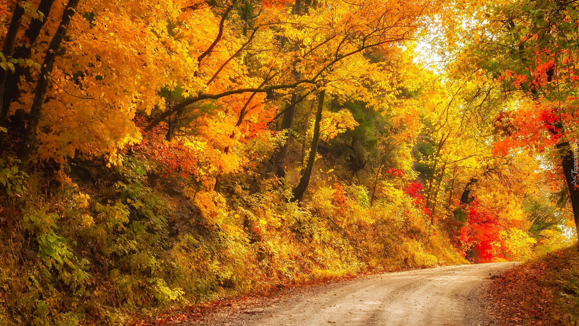 Edytor tapety: Droga wśród kolorowych jesiennych drzew
