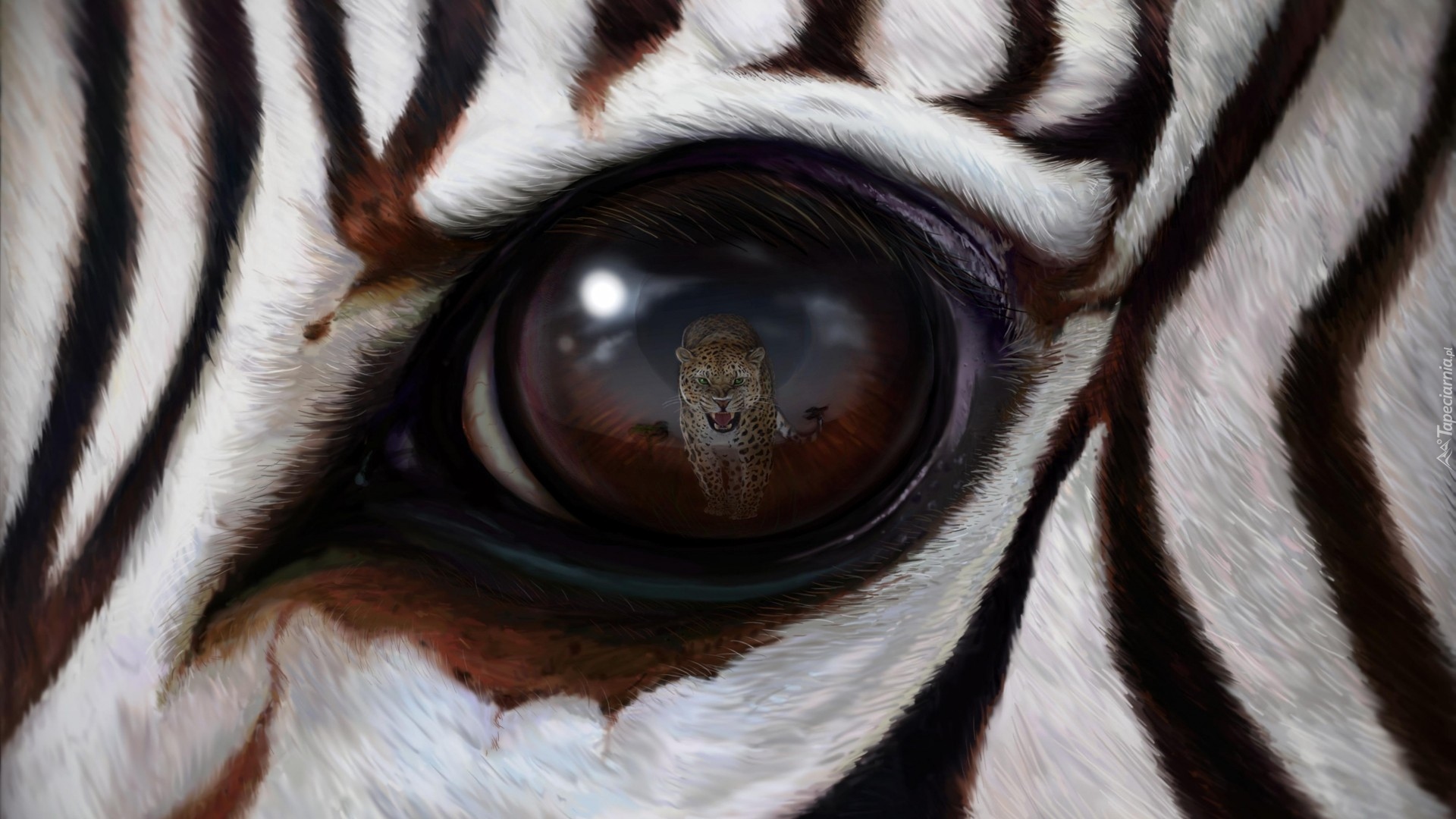 Edytor tapety: Lampart odbijający się w oku zebry