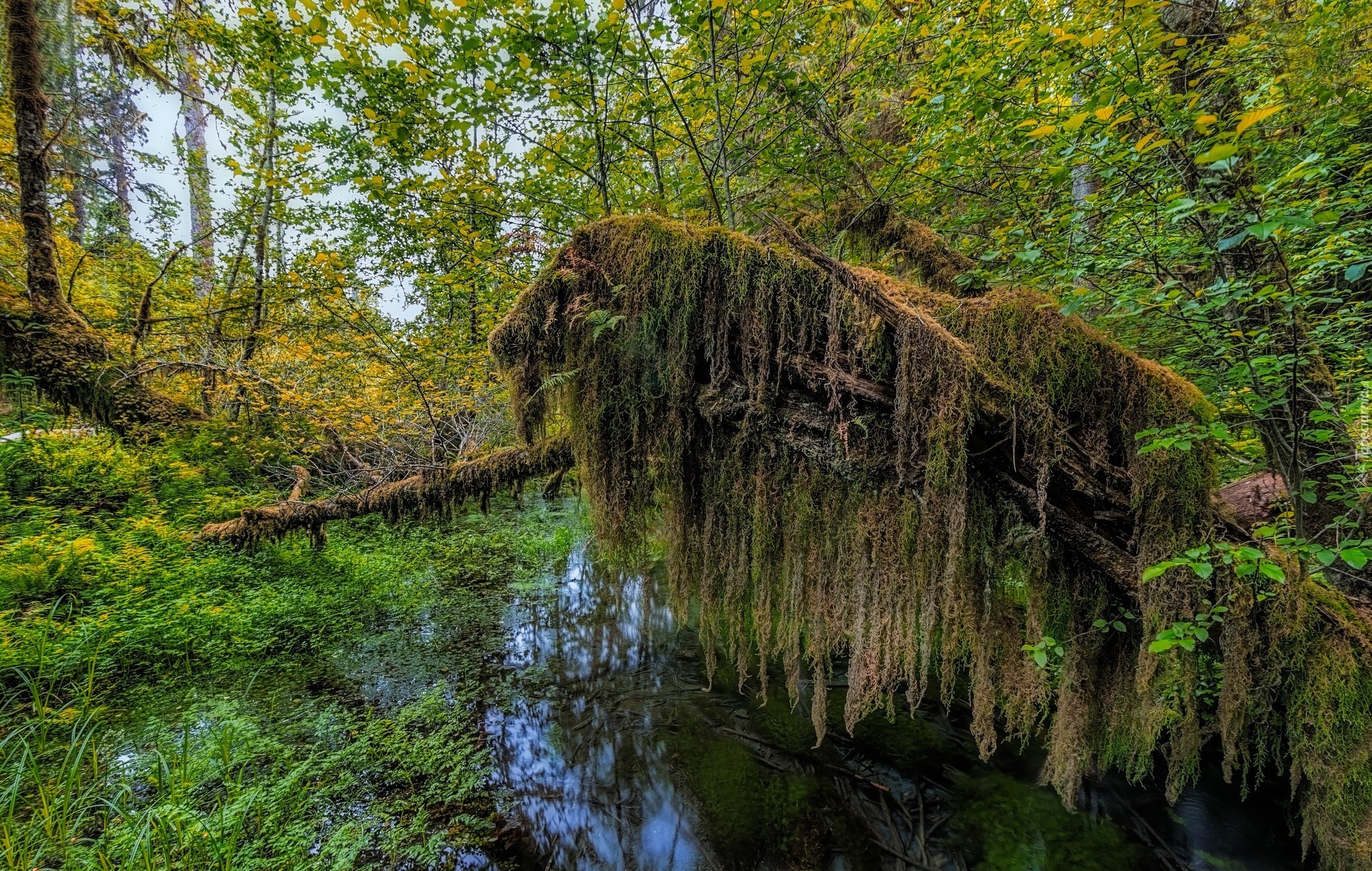 Edytor tapety: Powalone omszałe drzewa nad rozlewiskiem w lesie
