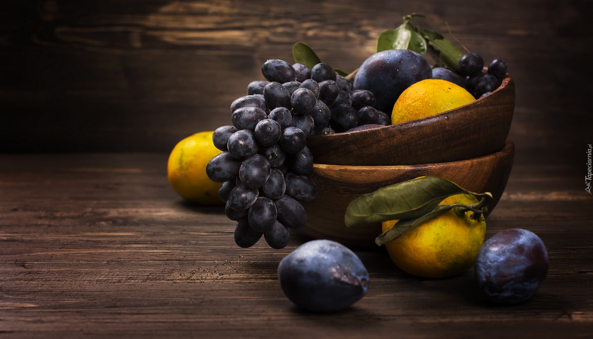 Edytor tapety: Miseczki z winogronami obok cytryn i śliwek