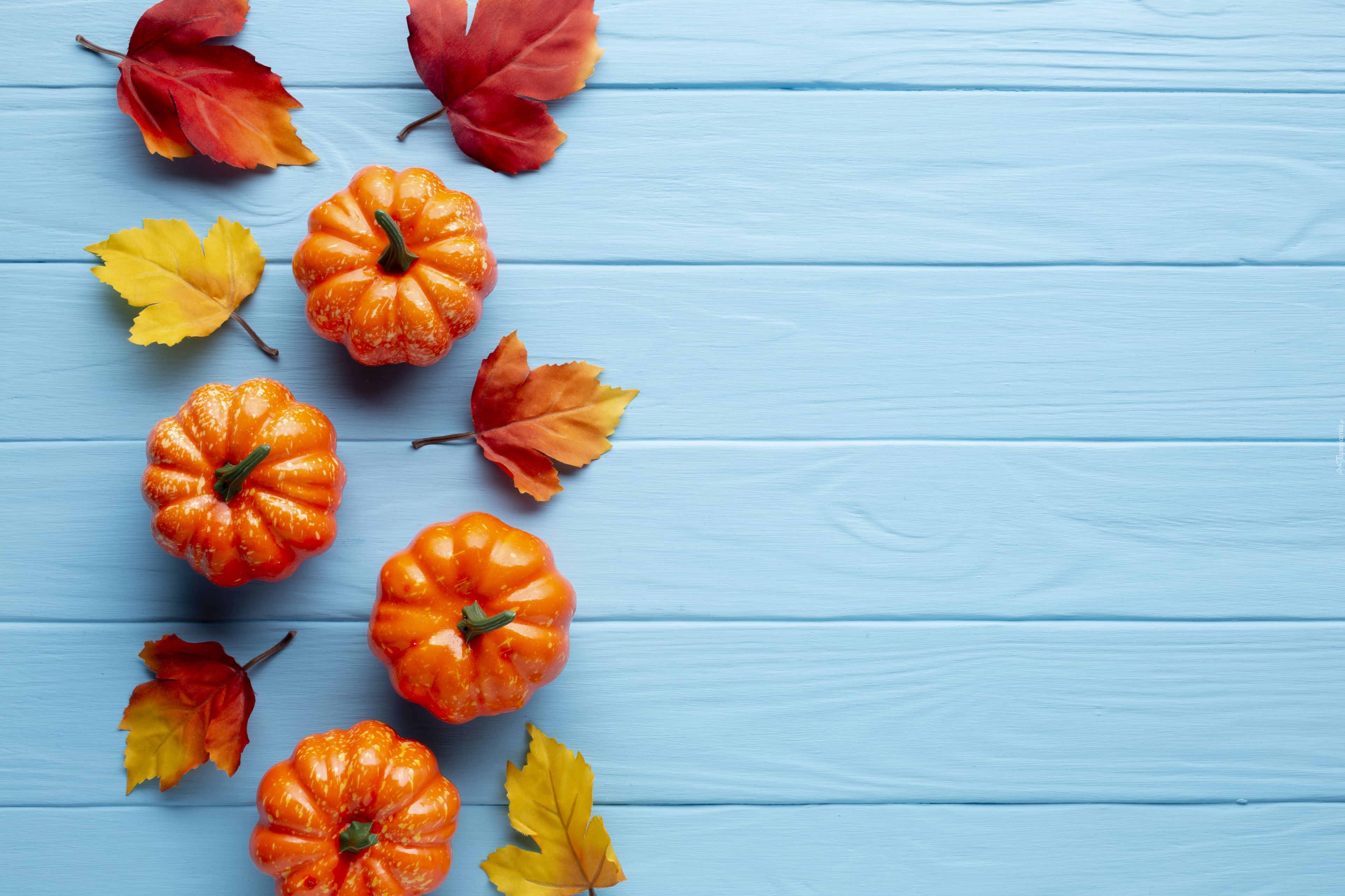 Edytor tapety: Sztuczne dynie i liście na deskach