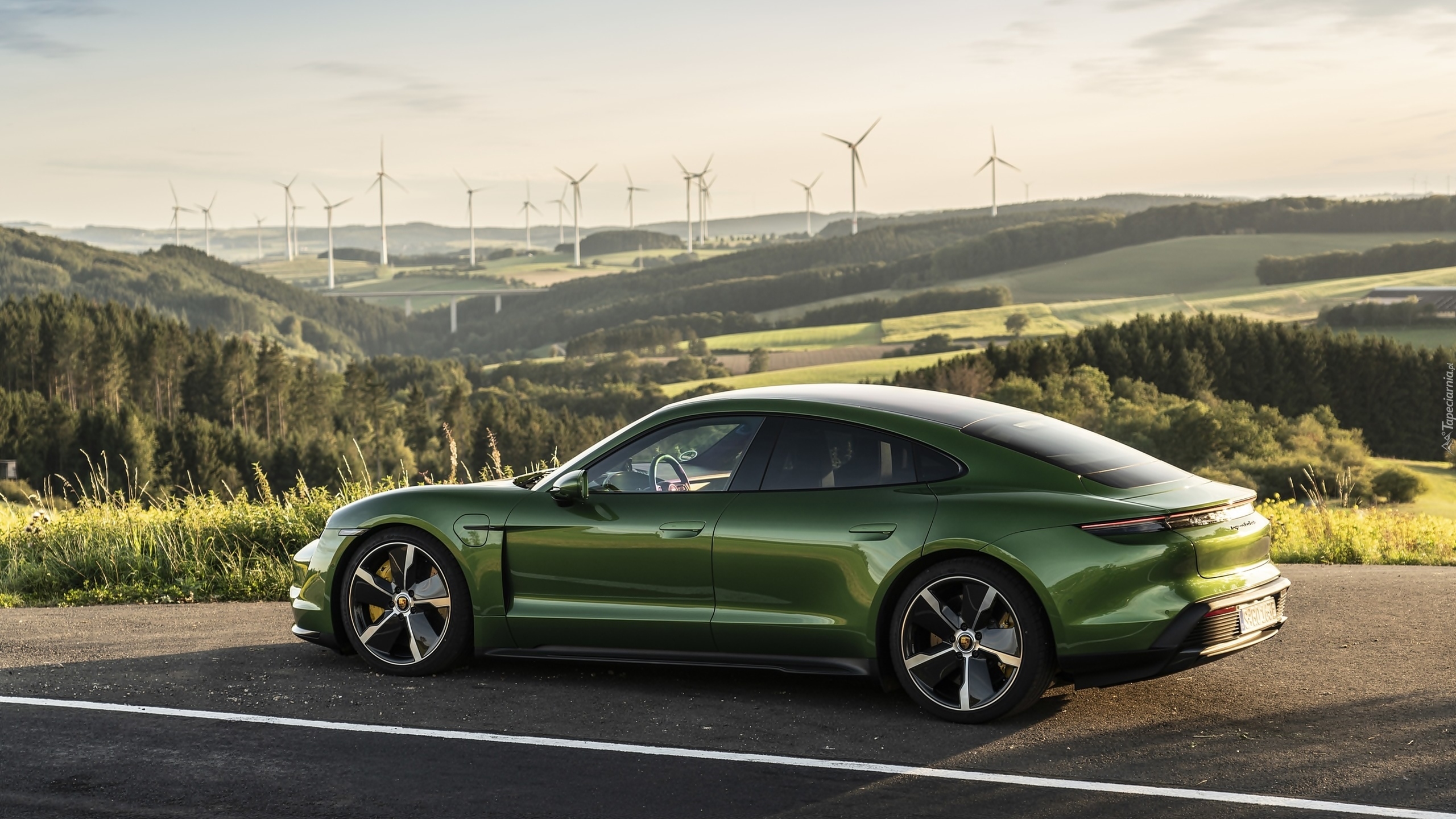 Edytor tapety: Zielone Porsche Taycan Turbo bokiem