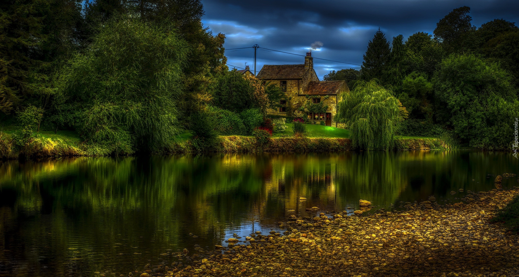 Edytor tapety: Dom pośród zielonych drzew nad rzeką