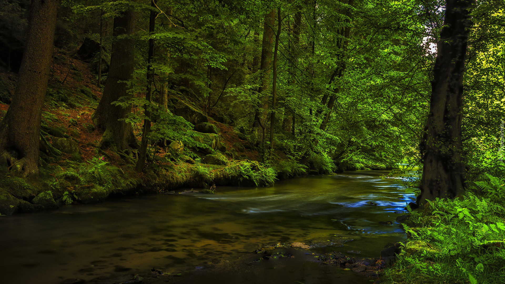 Edytor tapety: Zielone drzewa nad leśną rzeką