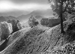 Edytor tapety: Stodoły na wzgórzu wśród jesiennych drzew