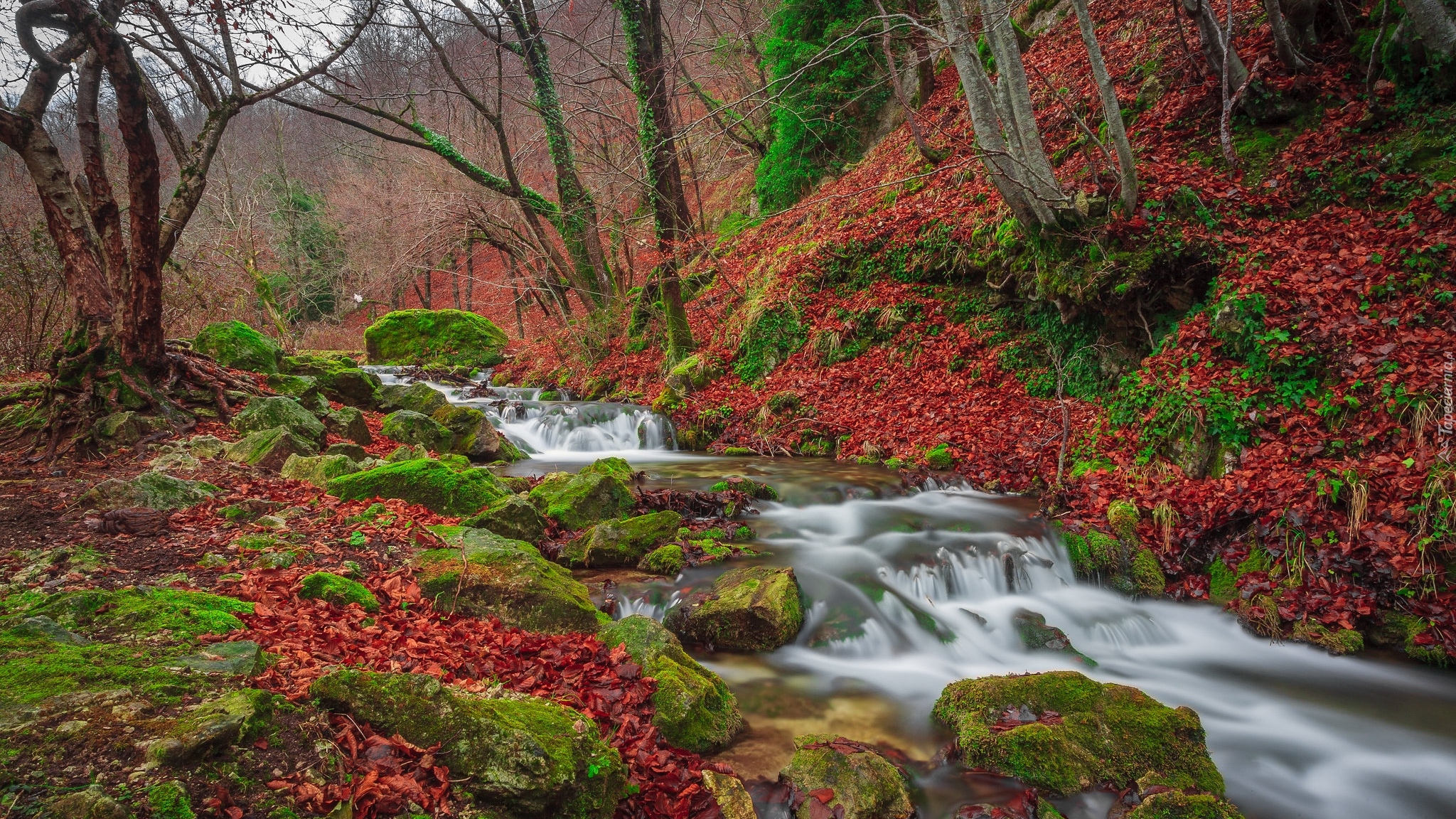 Edytor tapety: Opadłe liście na brzegu kamienistej leśnej rzeki