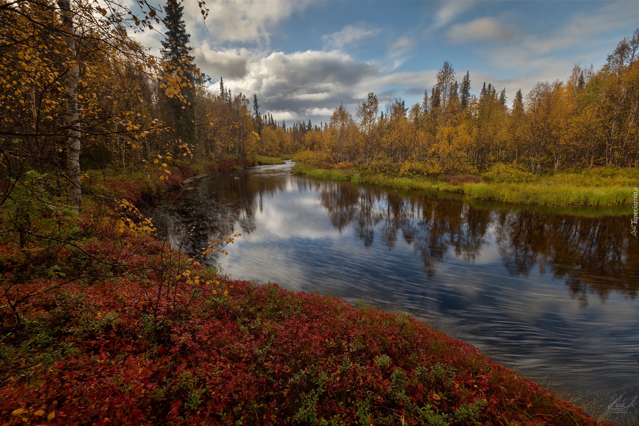 Edytor tapety: Drzewa wzdłuż rzeki jesienną porą